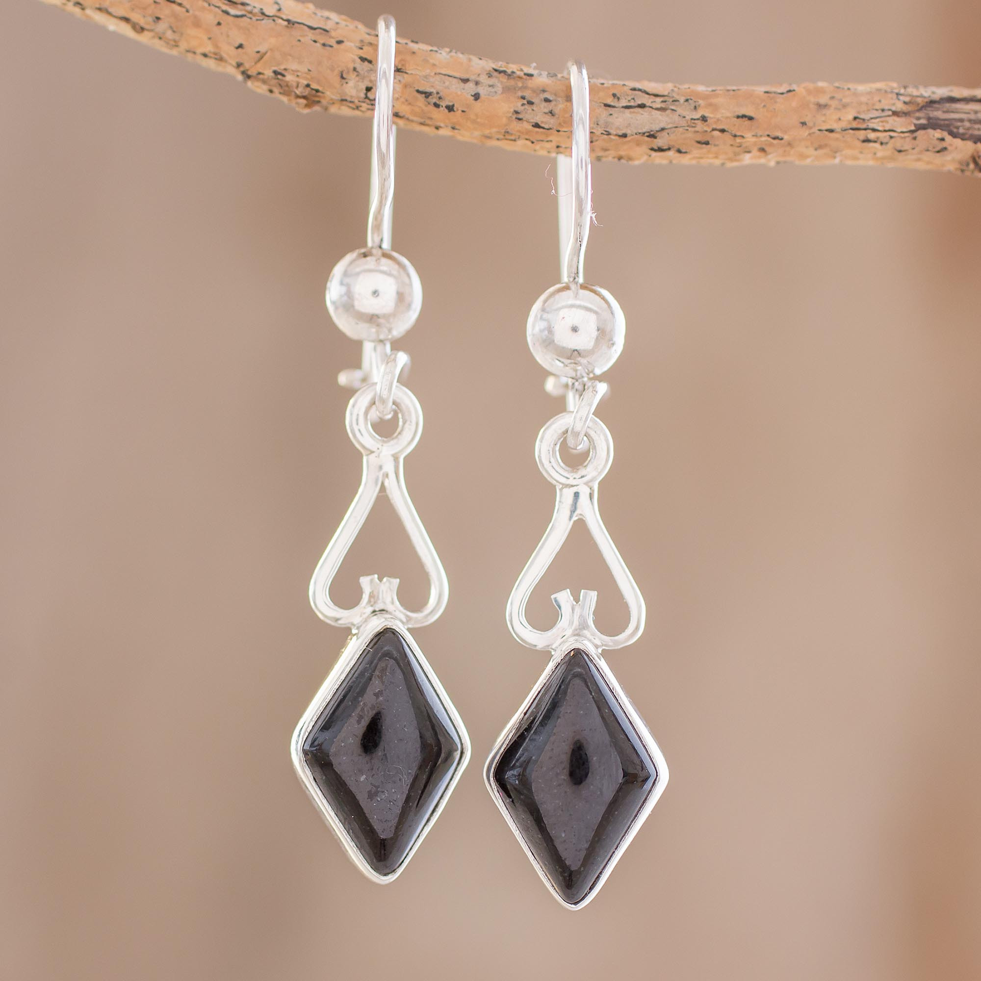 Diamond-Shaped Black Jade Dangle Earrings from Guatemala, 'Marvelous Black Diamonds'