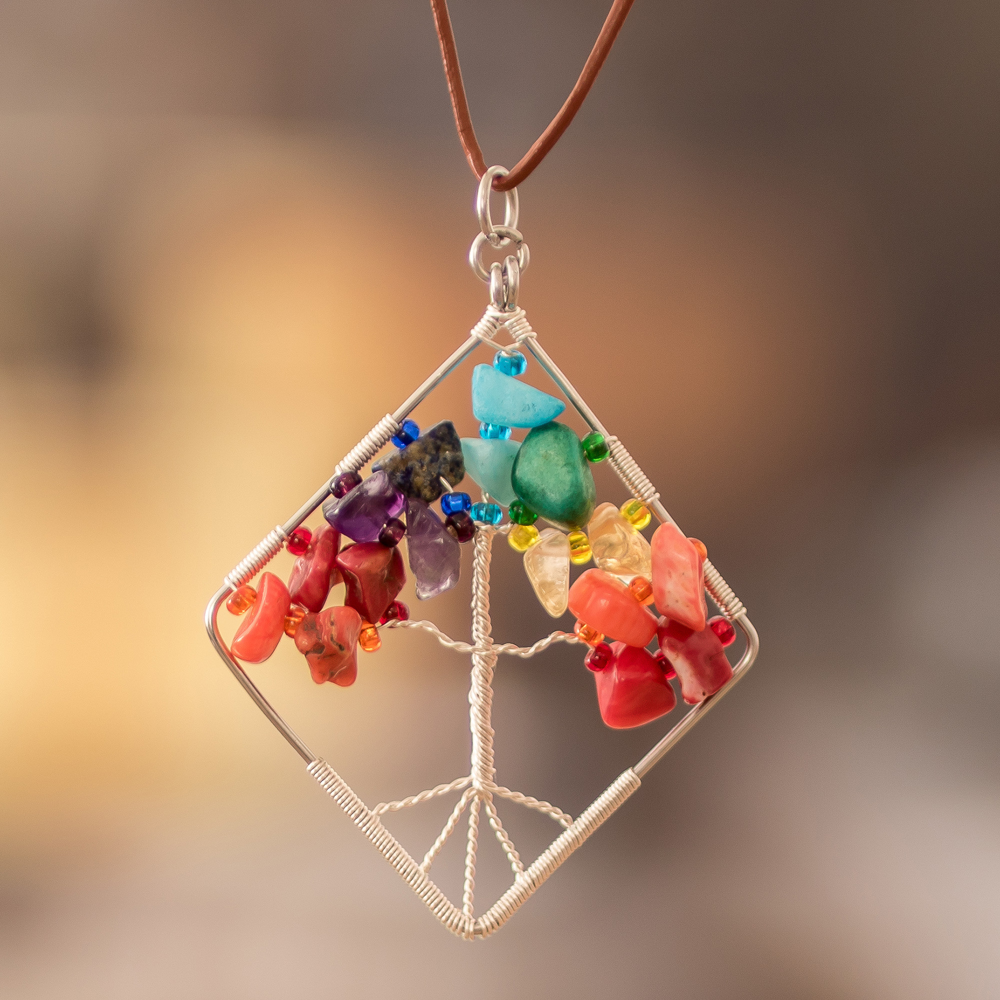 Diamond-Shaped Tree-Themed Multi-Gemstone Pendant Necklace, 'Nature's Rainbow Diamond'