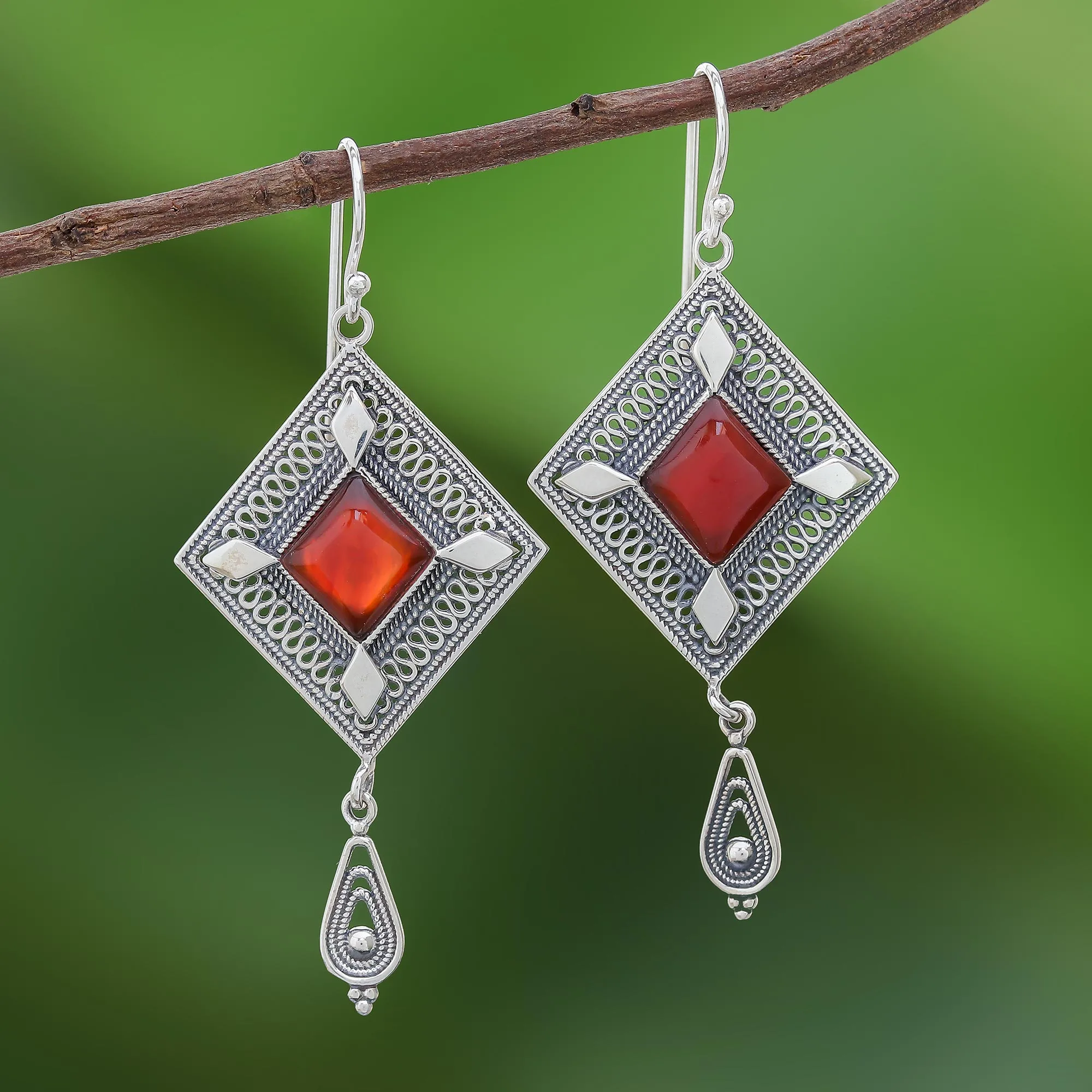 Diamond Shapes Sterling Silver and Carnelian Dangle Earrings, 'Silver Diamonds'