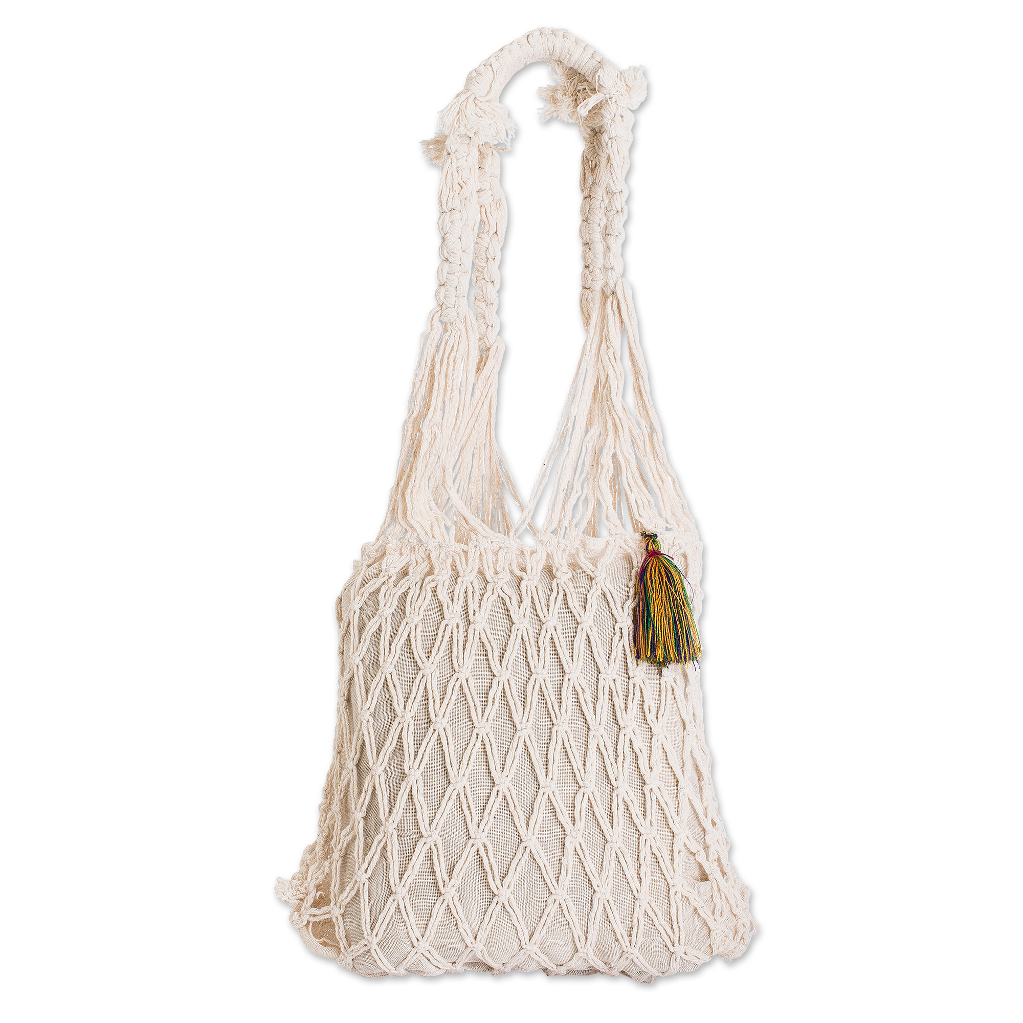 This fabulous diamond-patterned macrame shoulder bag is crafted with cotton by the artisans of the Mother Nature Group in Guatemala. The vanilla bag --which features a cotton lining and a multicolored tassel-- has exquisite macrame details and is ideal for those who love a relaxed, bohemian style.