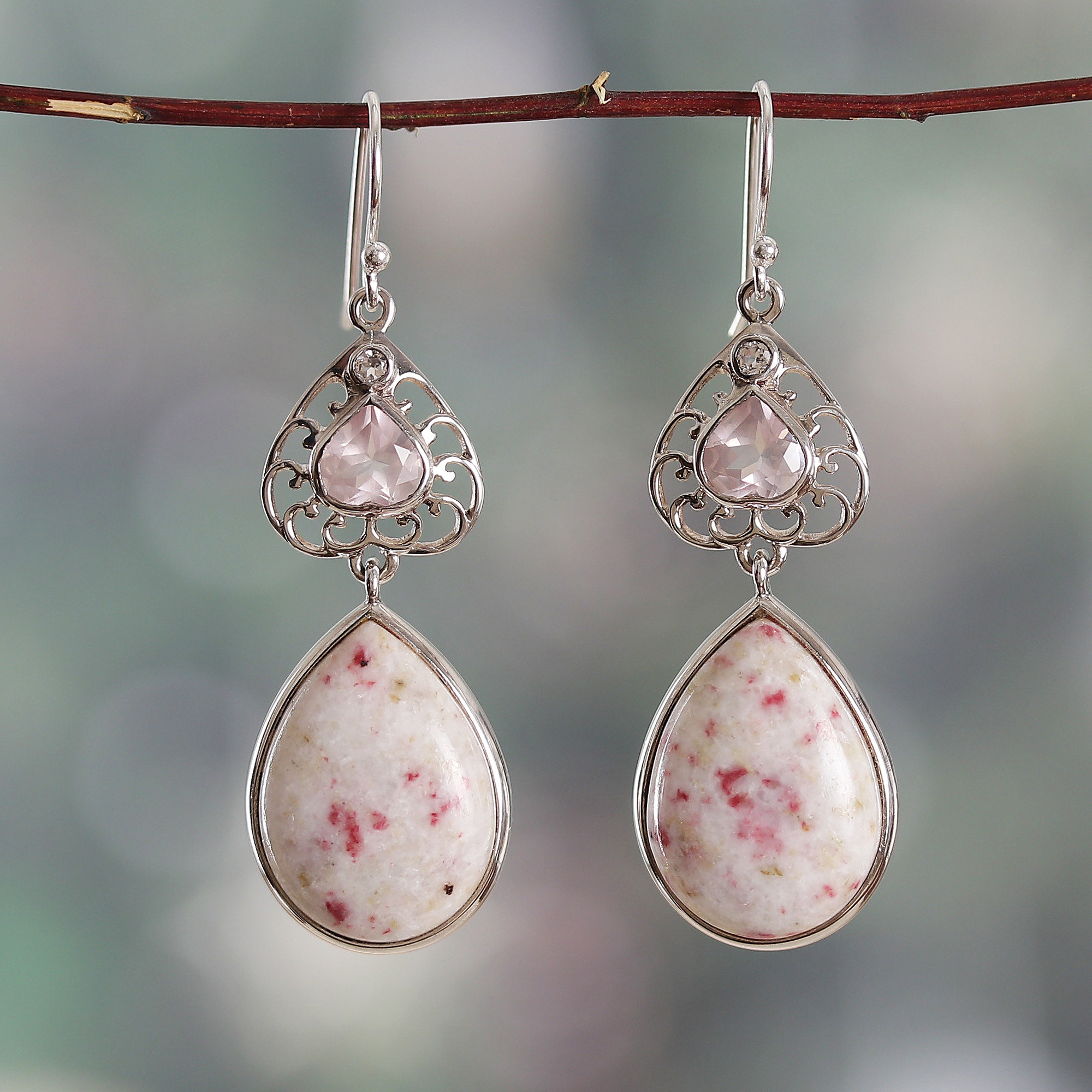 These mesmerizing dangle earrings orchestrate a symphony of pink and white, where rose quartz whispers sweet secrets alongside brilliant dolomite and sparkling white topaz. Each stone, whether faceted to catch light or smoothed into gentle cabochons, finds its perfect home in lustrous sterling silver settings, showcasing Shubhra Singh's masterful vision of Indian jewelry artistry.