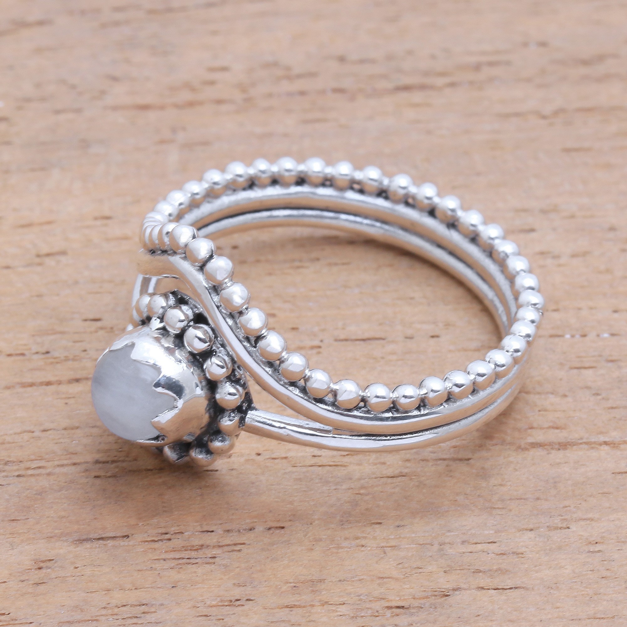 Enshrined within a sterling silver bezel, a cabochon of natural rainbow moonstone gleams in this cocktail ring from Bali. Featuring a design by Ketut Sulastri, the ring is crafted of sterling silver. Expertly crafted dot motifs decorate the band.