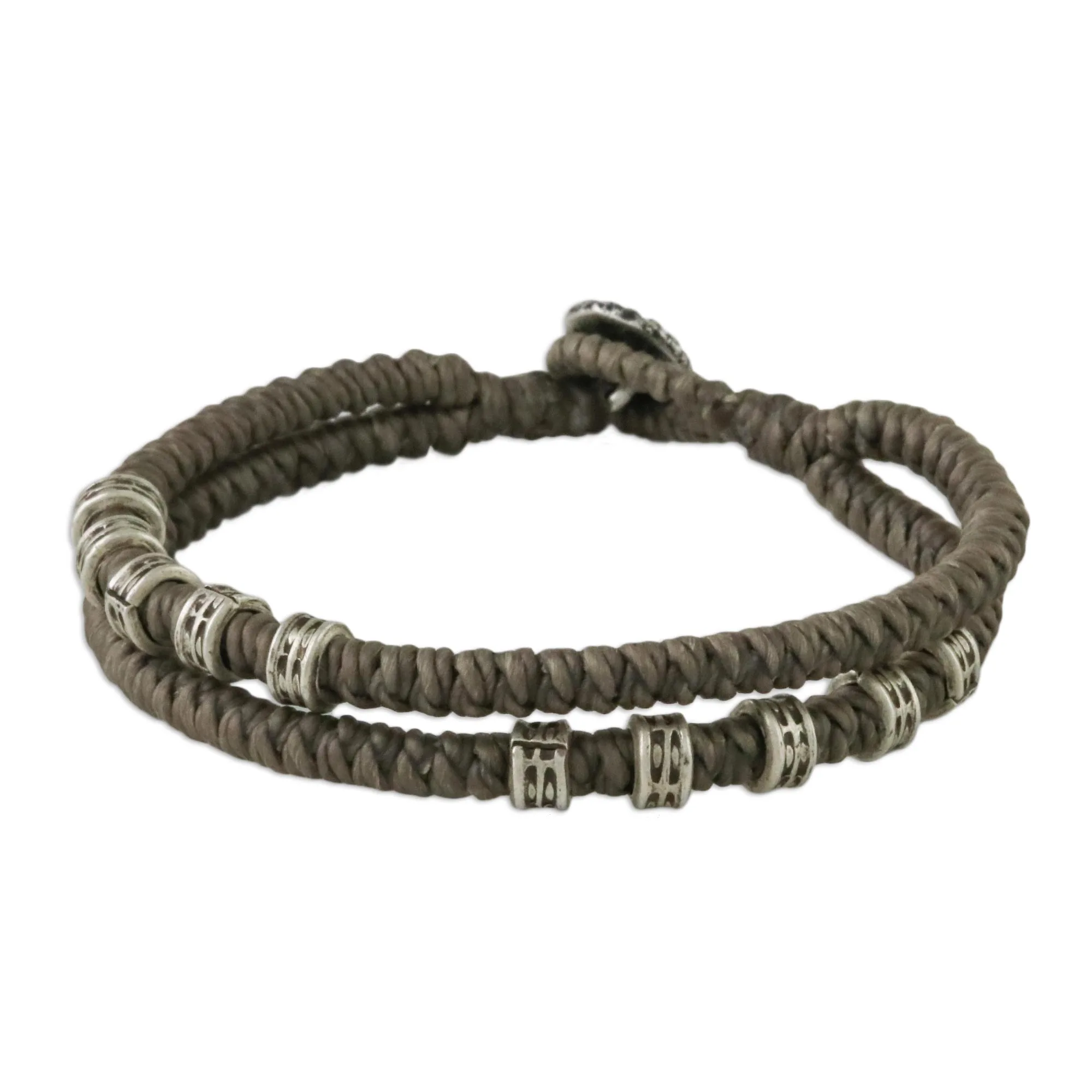 Two lengths of grey braided cord run side-by-side, circling the wrist. Thai artisans craft this red wristband bracelet, which features a design by Napapat. She adds beads of silver, handcrafted by Karen hill tribe silversmiths. The bracelet closes with a silver button.