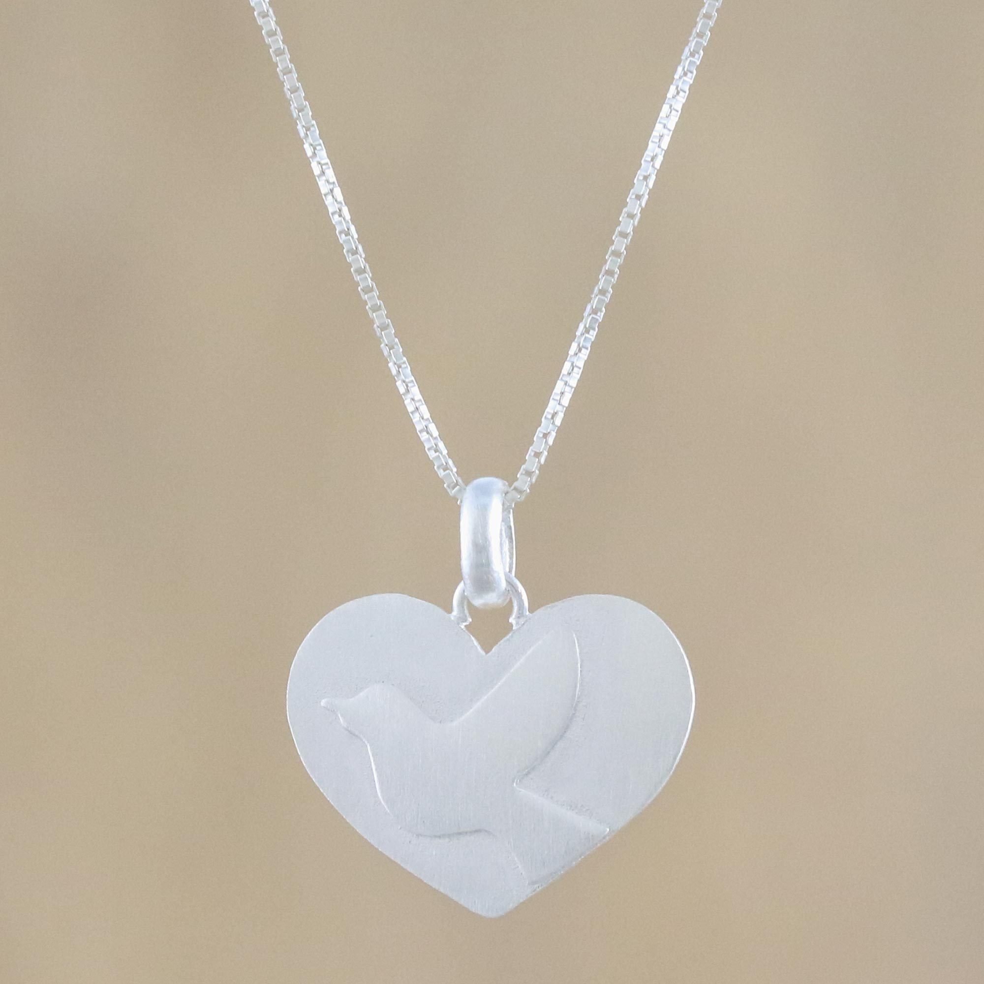 Thailand's Sarote Lochotinunt presents a lovely addition to your jewelry chest. Crafted of sterling silver with a shimmering, brushed satin finish, the pendant of this necklace features a heart shape with the embossed image of a dove.