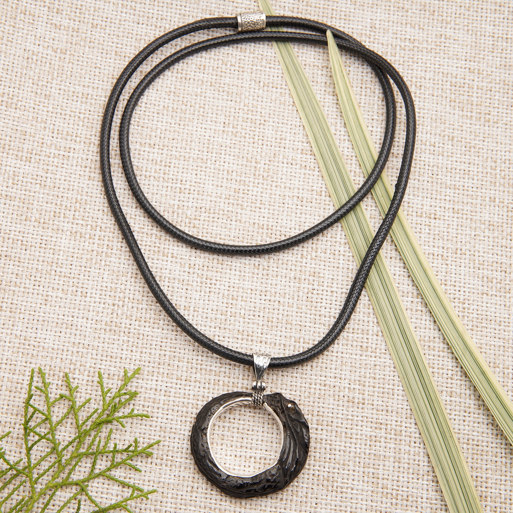 Embodying wisdom, strength and divinity, the dragon's spirit blesses this magnificent necklace crafted by Maria and Gennadii in Bali. Made on a round sterling silver structure, the accessory features a hand-carved depiction of this mythical creature, all made from a horn in a natural dark hue that adds a mysterious vibe to the piece.