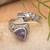 The story of the wise and resilient dragonfly continues in this sterling silver wrap ring by Dewi Putera of Bali. The artisan combines traditional details with an exquisite silversmithing job that allows her to create an intricate pattern of sylvan inspiration. An 18k gold-plated accent decorates one end, while a faceted amethyst completes the design with a stunning purple hue as a symbol of wisdom.