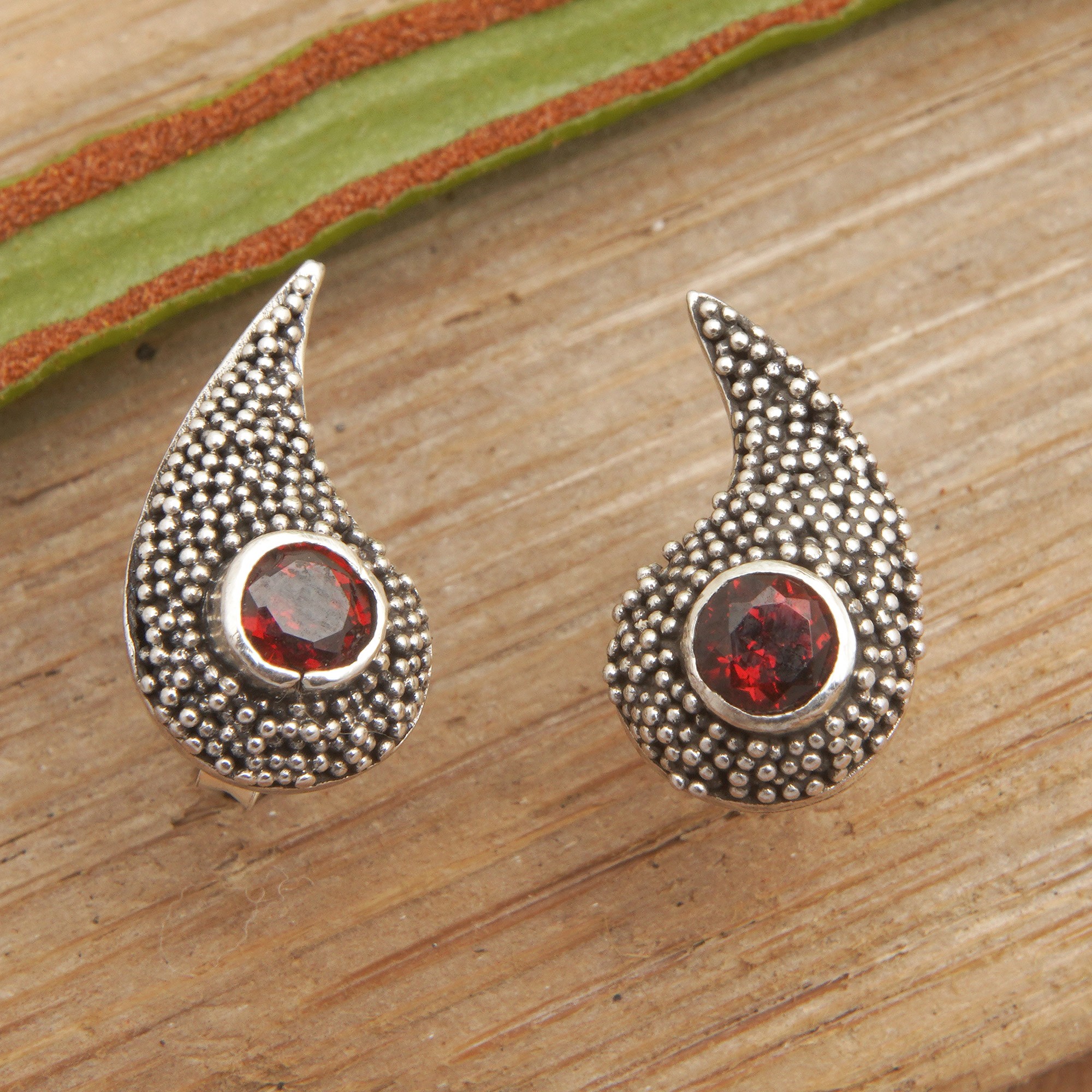 Myriad sterling silver beads take over these drop-shaped button earrings crafted by master artisan Ketut Udiana in the always beautiful lands of Bali. After using advanced techniques, the artisan decorates each piece with an oxidized finish, enhancing the intense red hue of the natural garnet stones that crown the design as a symbol of passion and perseverance.