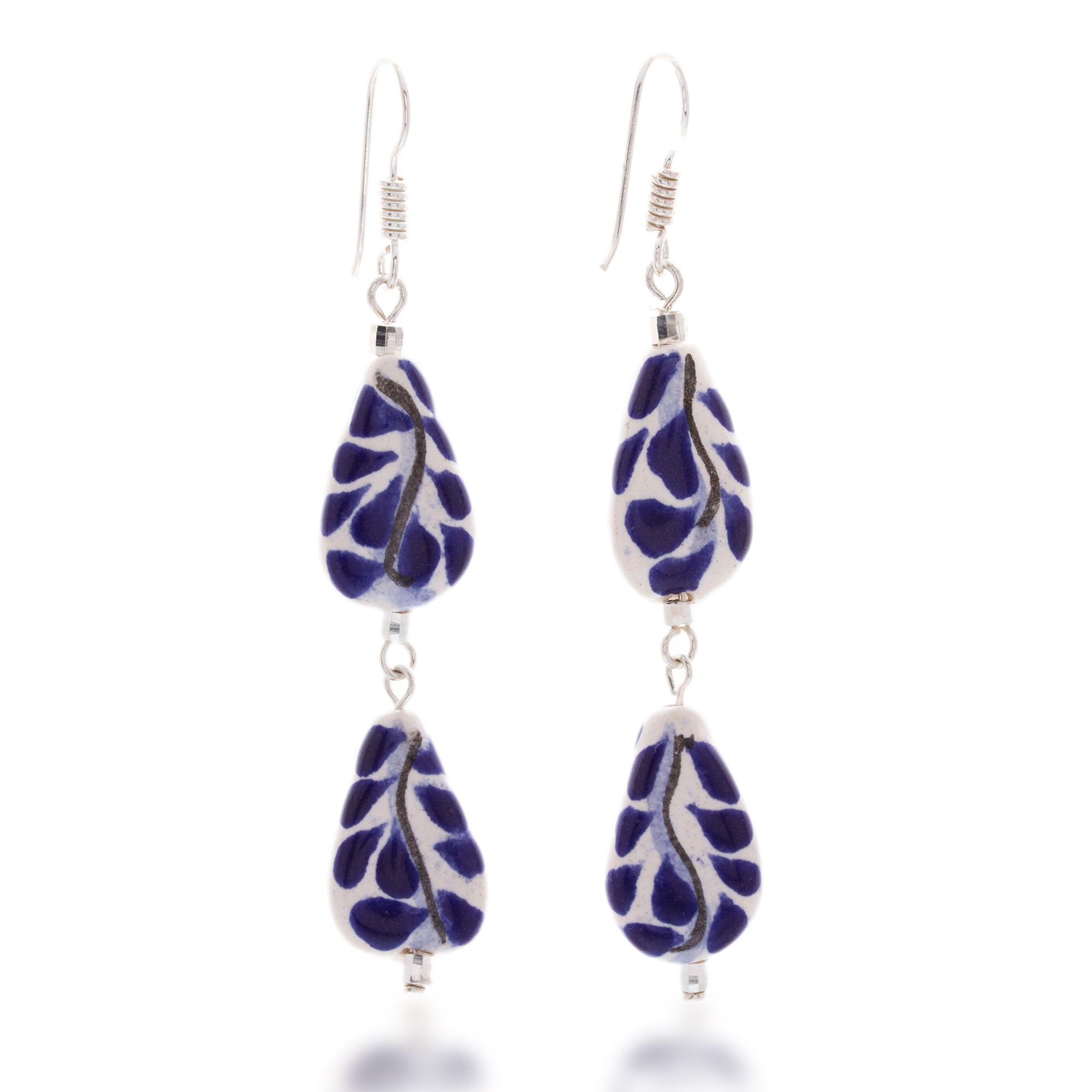 Charming drops and little leaves unite in this enchanting design from Mexican lands. Artisan Juana Ponce honors the classic Talavera art style in these ceramic dangle earrings, hand-painted in blue and accented with sterling silver details.