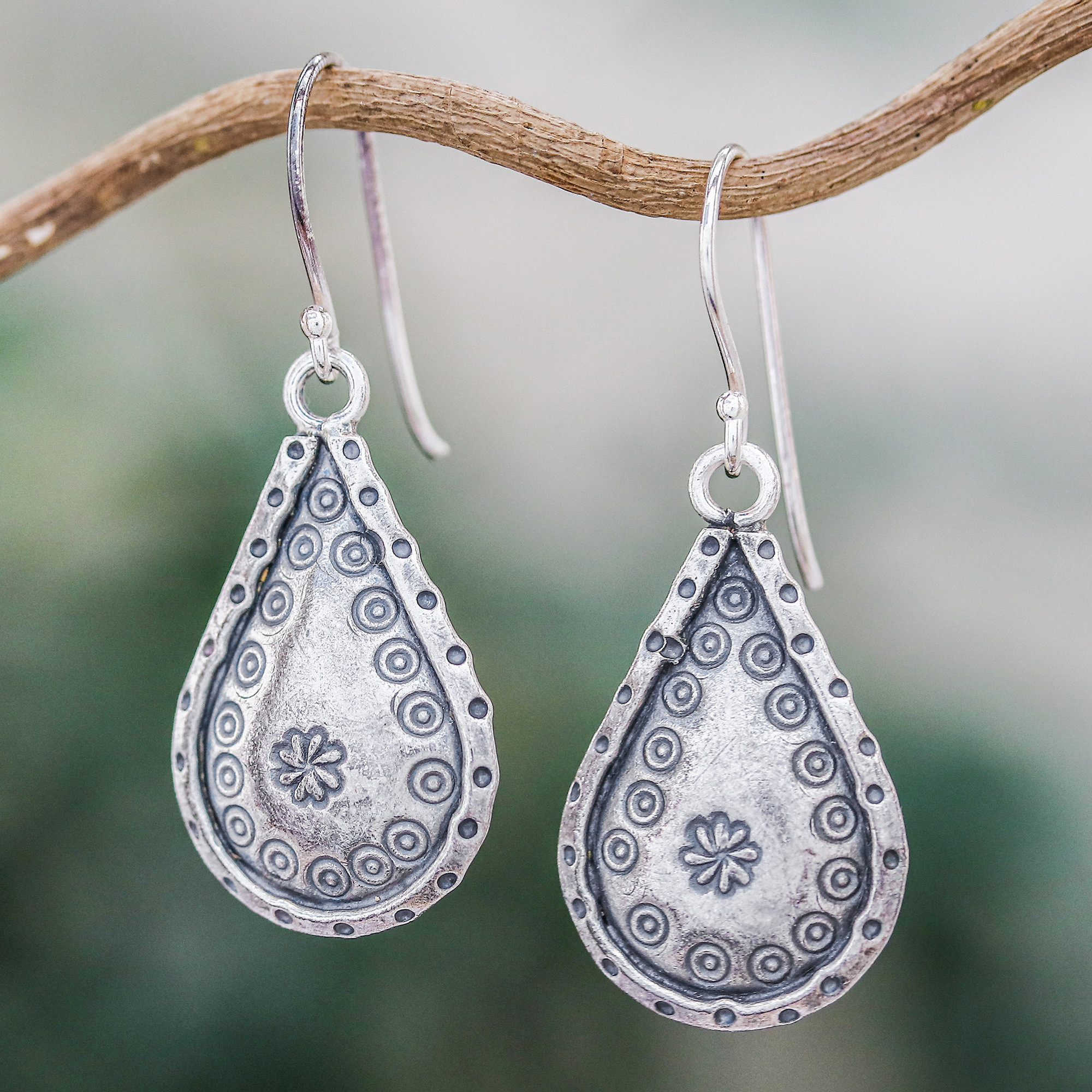 Add a refreshing touch to your wardrobe with this pair of dangle earrings from Thailand. Offered by Chanatip Na Lampoon, these earrings are handcrafted from Karen hill tribe 950 silver and stamped with oxidized floral and circle patterns.
