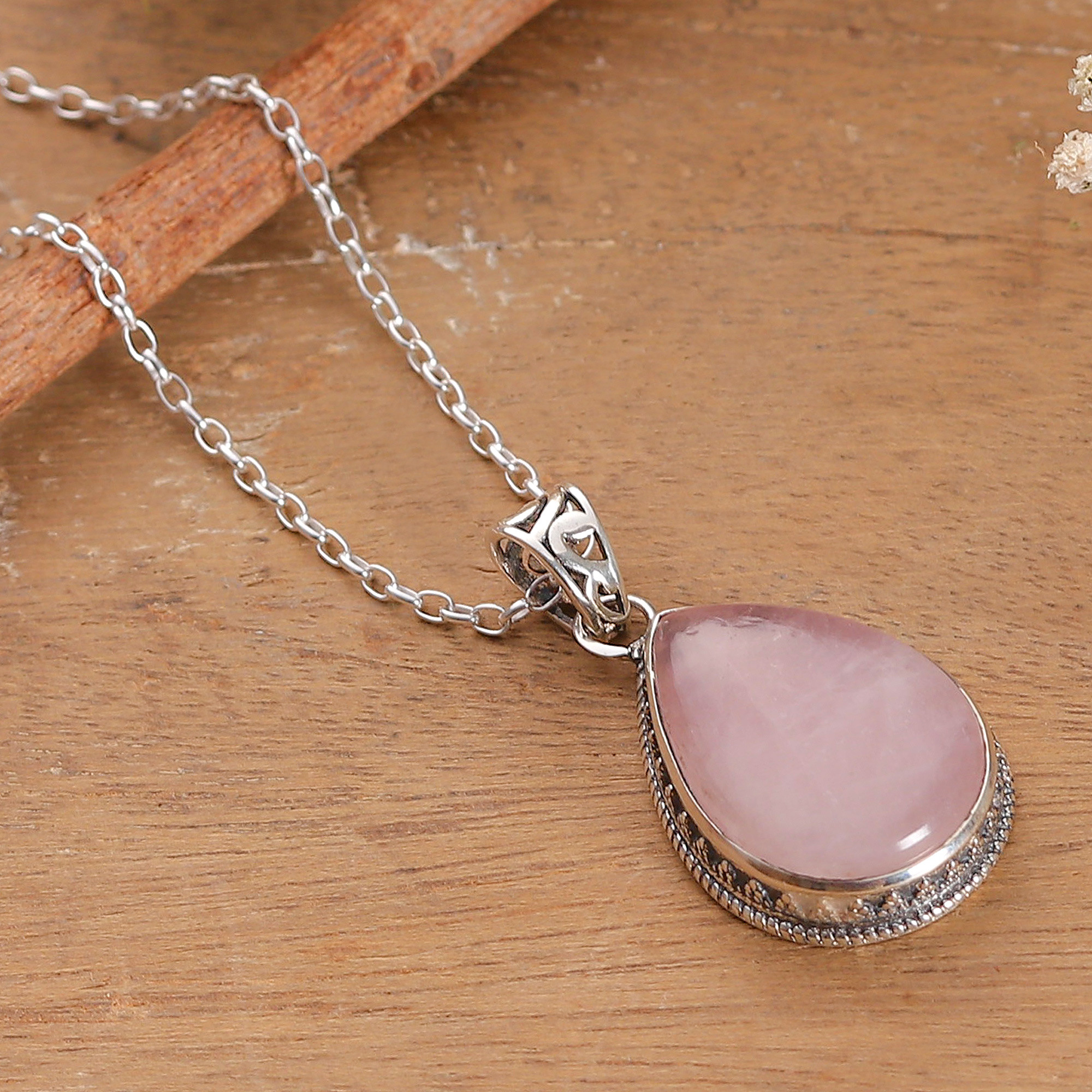 Drop-Shaped Natural Rose Quartz Pendant Necklace from India, 'Unconditional Drop'