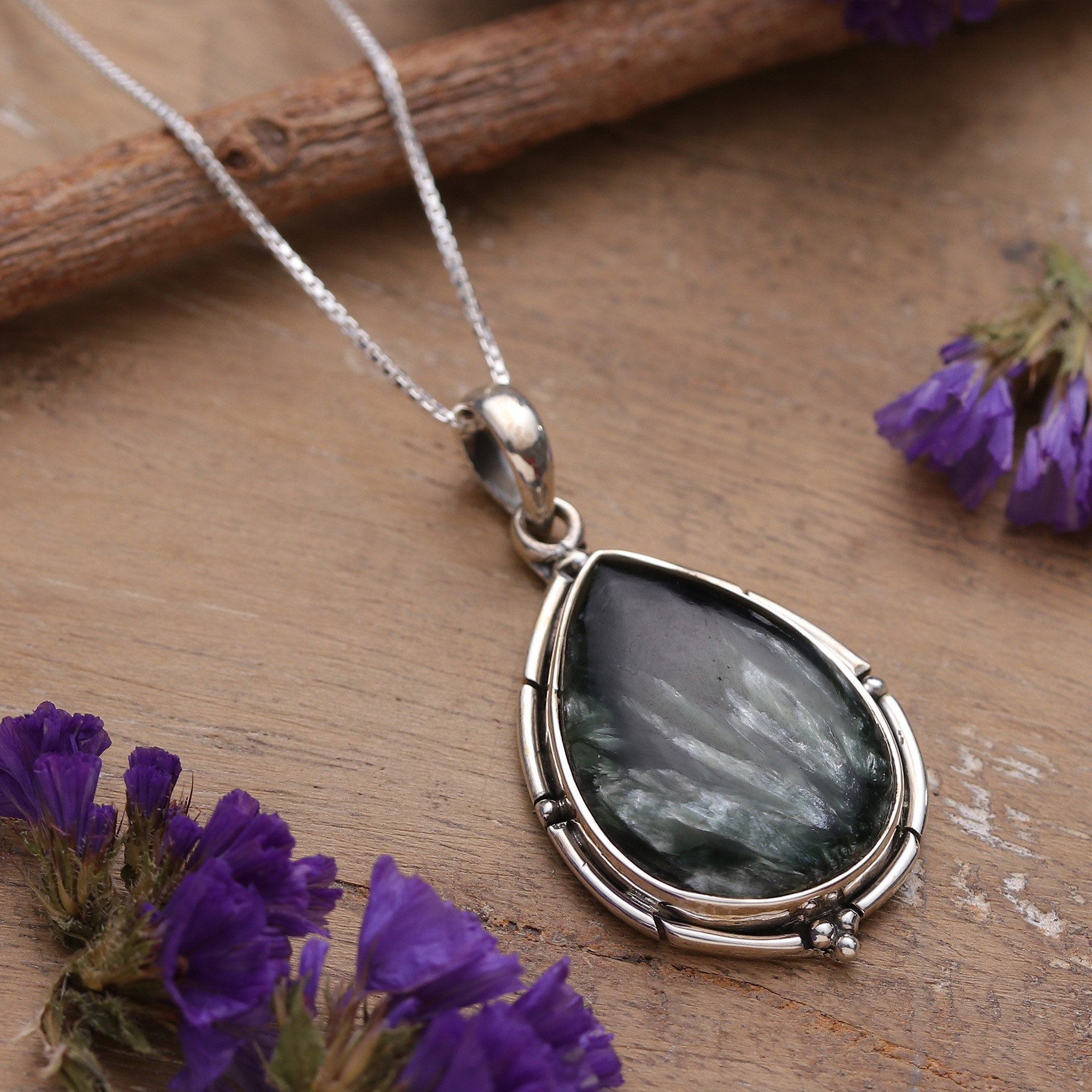 Drop-Shaped Natural Seraphinite Cabochon Pendant Necklace, 'Vitality Drop'