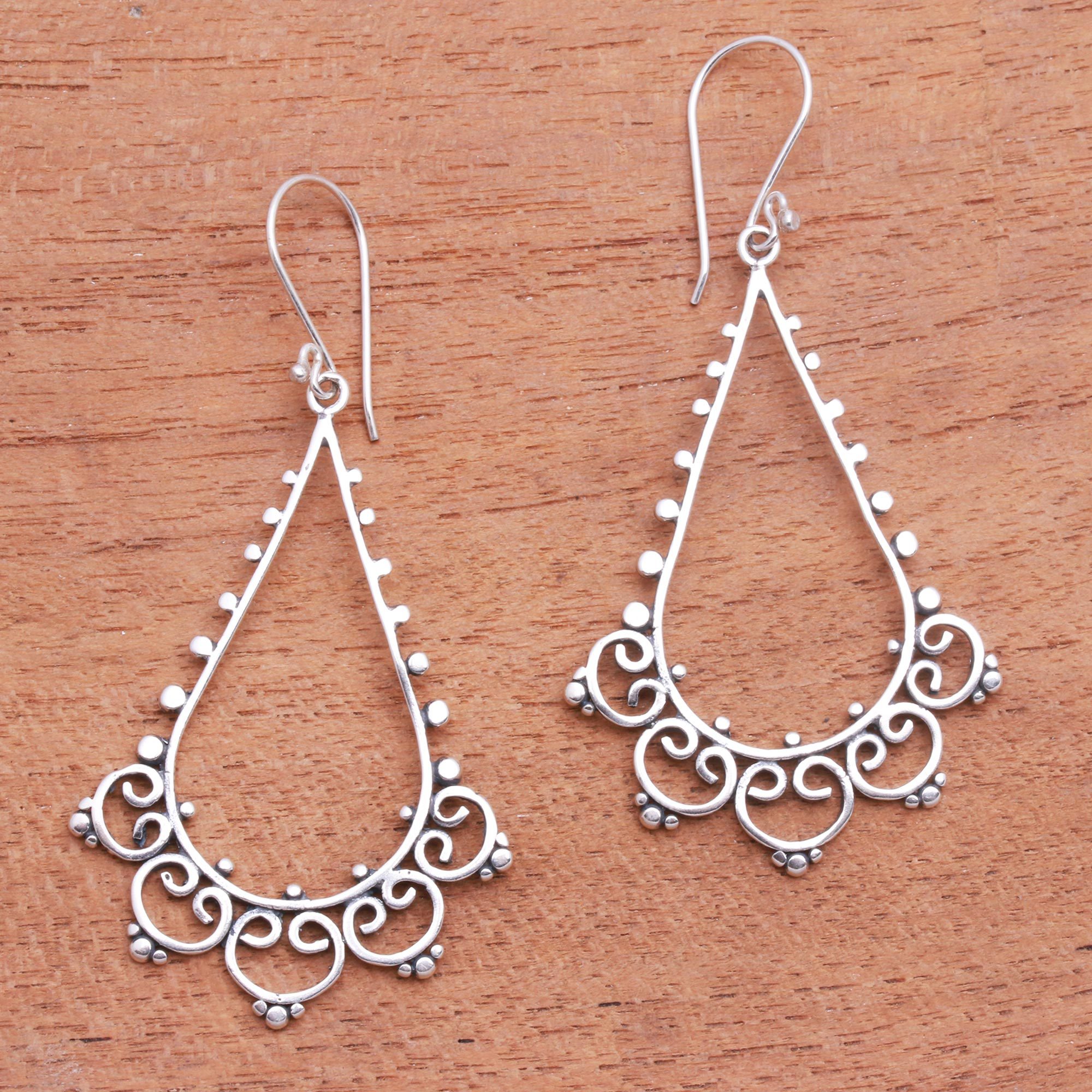 Created by Kadek Satya, these dangle earrings from Bali possess a rare beauty. Each drop-shaped earring is detailed with fascinating dot and swirl patterns that are handcrafted from sterling silver.