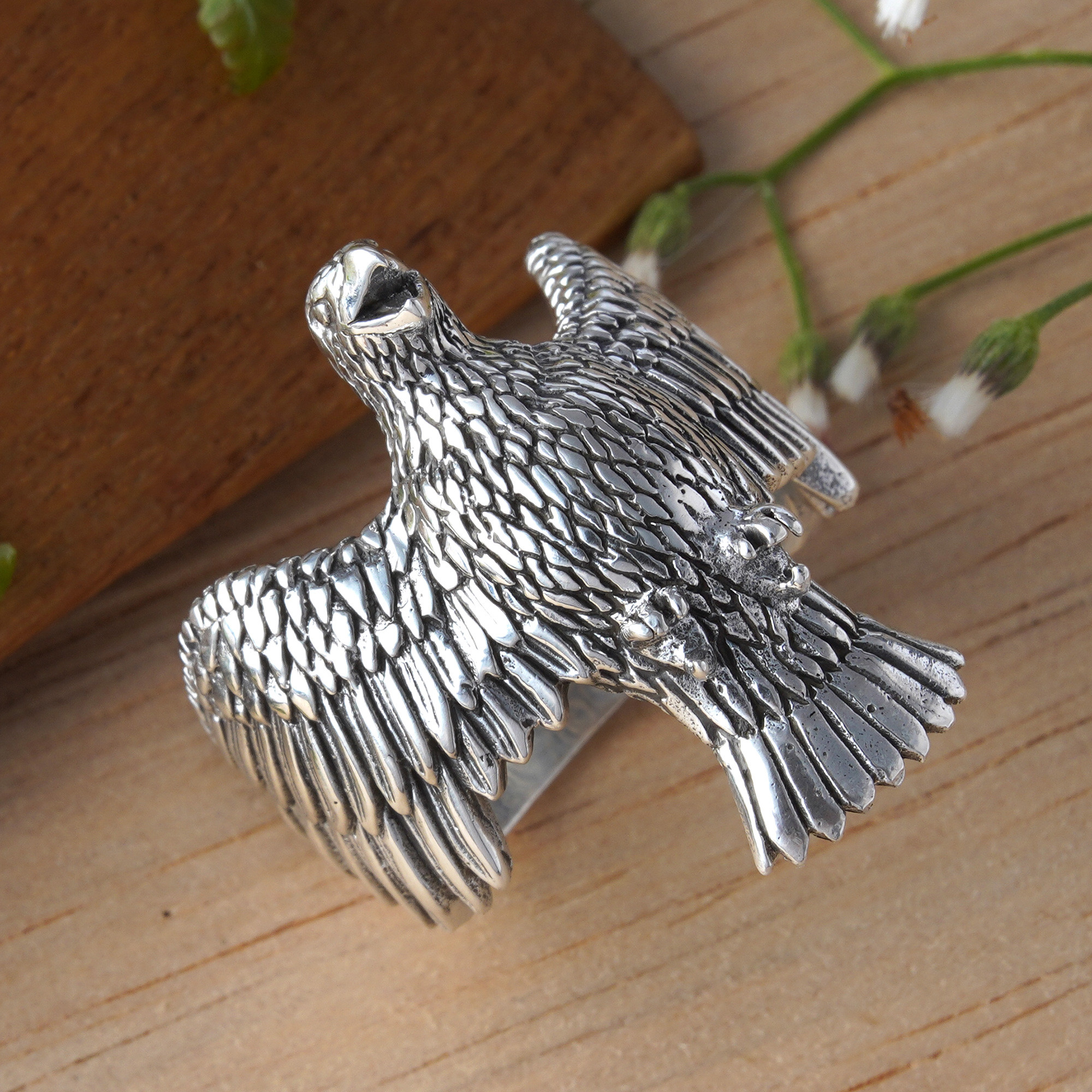 The mighty spirit of eagles emerges from sterling silver in this cocktail ring where one of nature's most captivating creatures becomes a precious companion for your hand. Balinese artisan Dewi Putera's attention to textural detail brings dimensional reality to the design, creating surfaces that invite touch and closer examination.