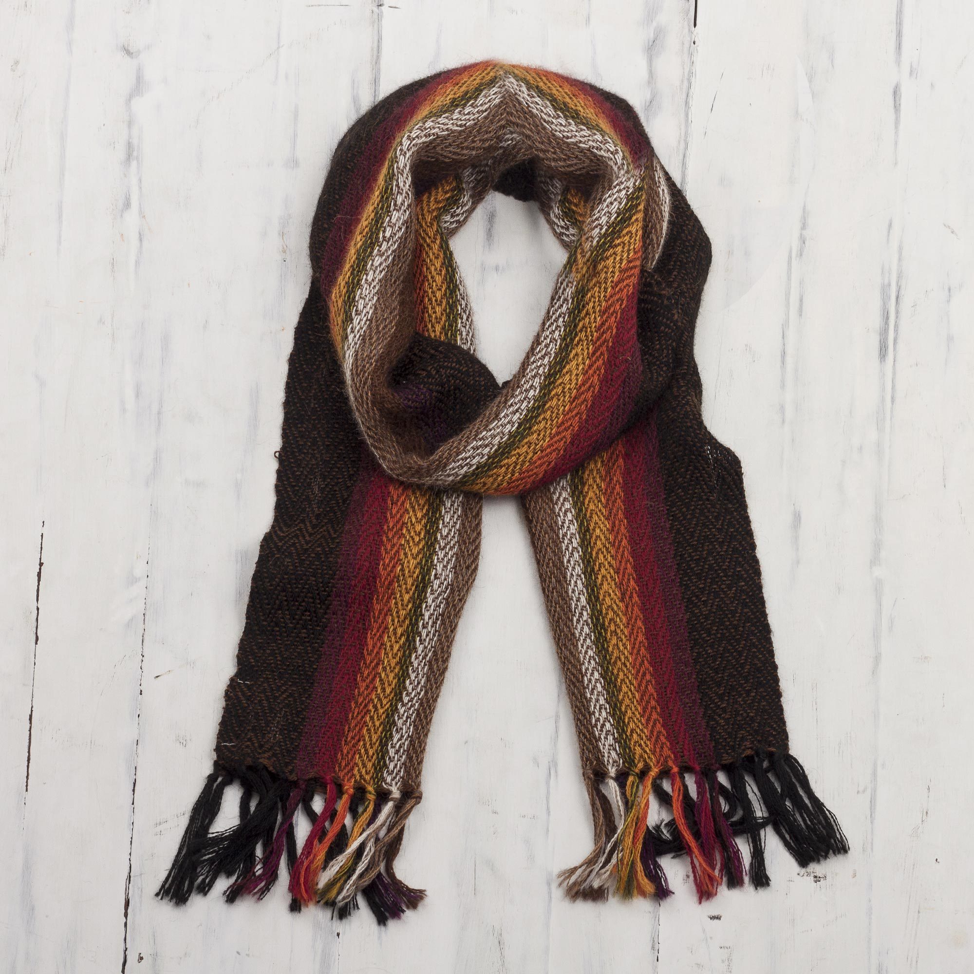Earthy stripes of brown, orange, red and ocher distinguish this cozy 100% alpaca scarf from Peru's Ulloa Family. The scarf is woven on a traditional loom and features hand-knotted fringe on both ends.