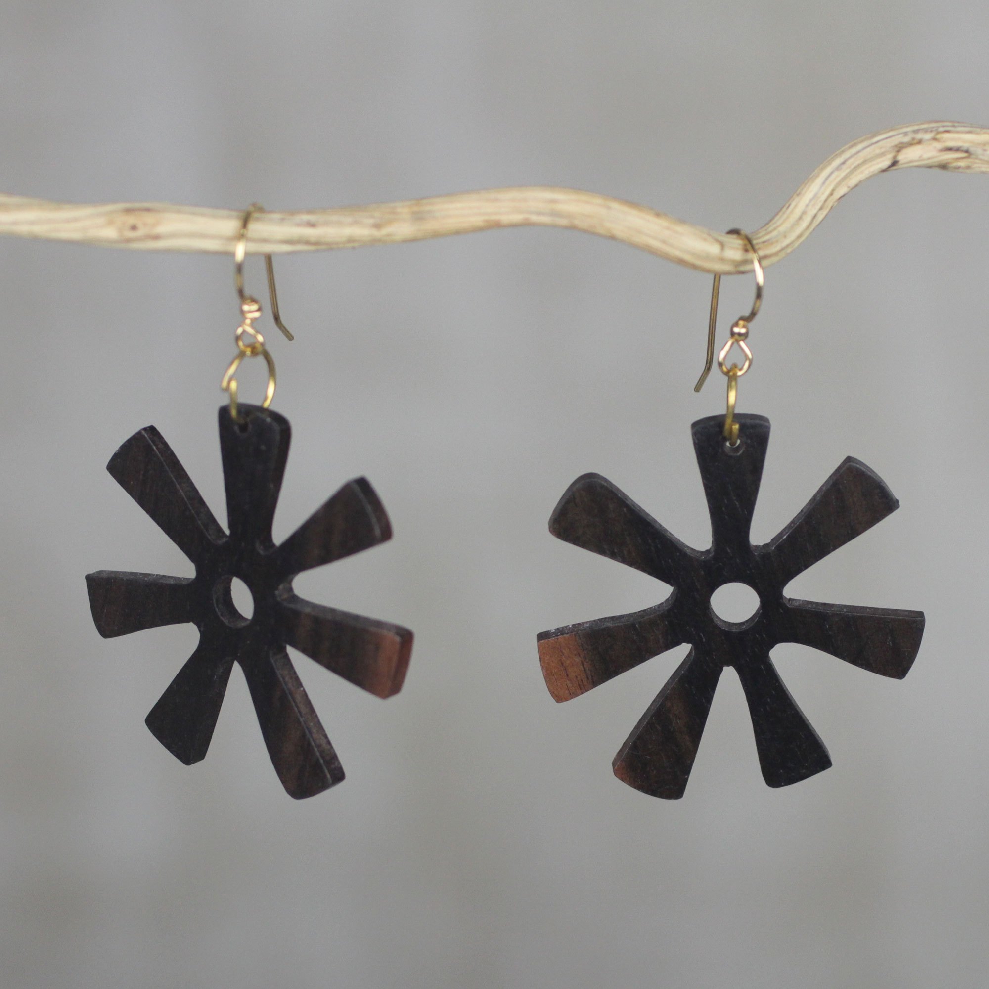 Ebony Wood Adinkra Flower Dangle Earrings from Ghana, 'Fofoo Flower'