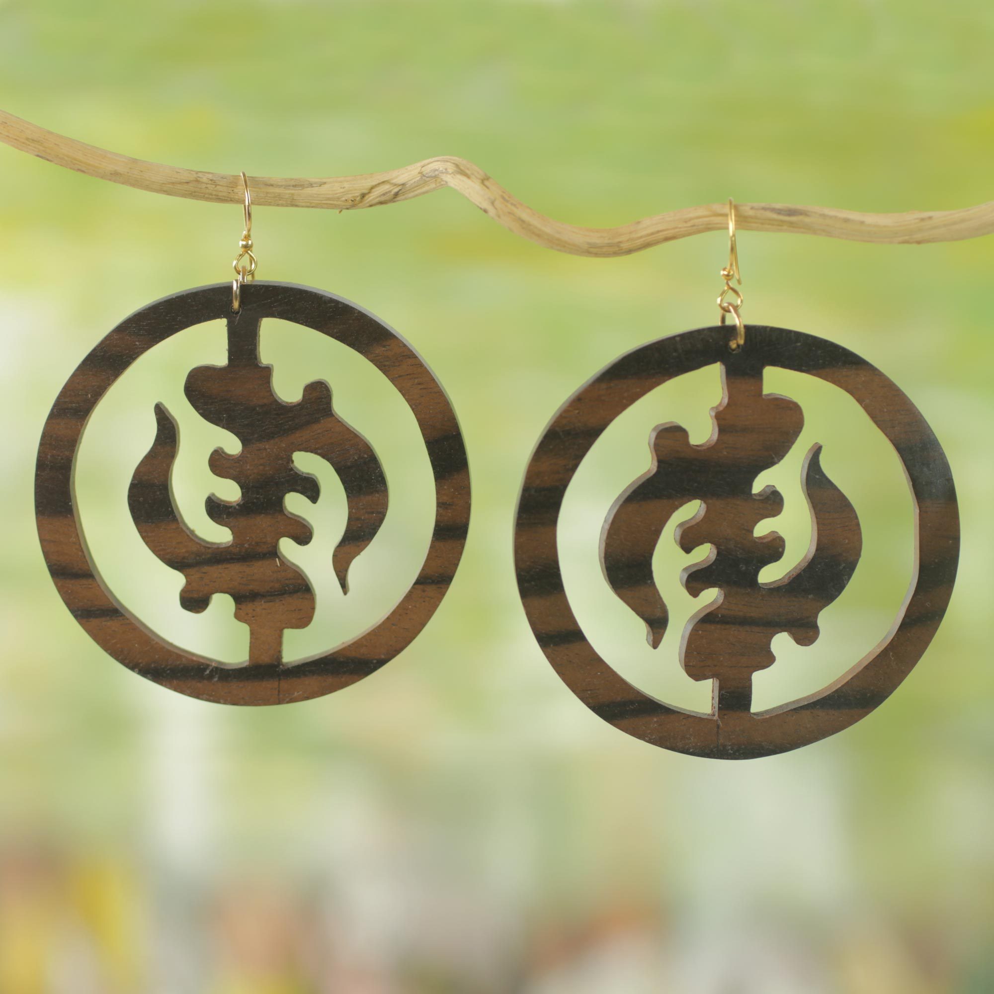 Ebony Wood Circular Adinkra Dangle Earrings from Ghana, 'Round Gye Nyame'