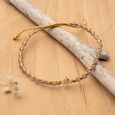 Boasting an enchanting palette, this trendy macrame pendant bracelet proves that sustainable fashion can be absolutely breathtaking. A recycled glass pendant takes center stage, letting its pink hue be framed by 18k gold-plated accents. Amethyst stones complete the accessory with purple sparkles that symbolize wisdom, whereas an adjustable sliding knot closure allows Made Masna's design to be perfect for any occasion.