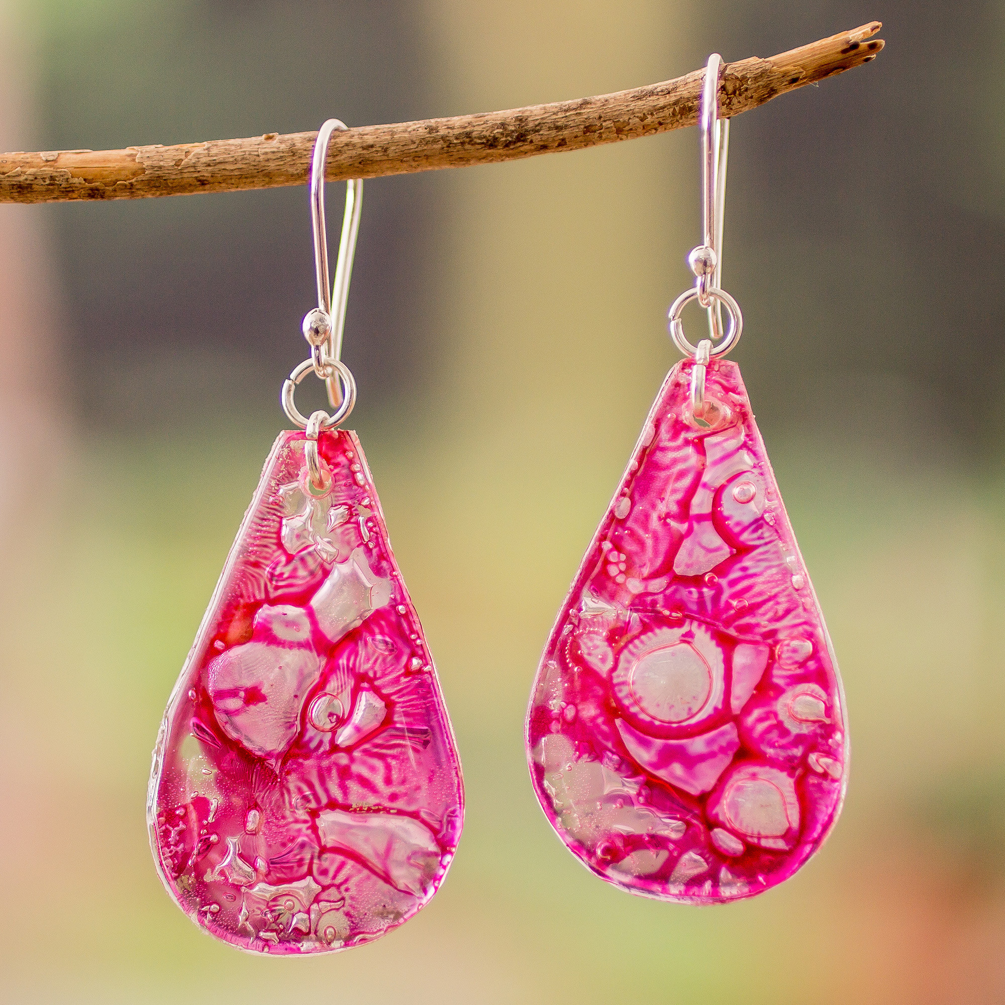 Eco-Friendly Drop-Shaped Fuchsia Recycled CD Dangle Earrings, 'Grace Drops'