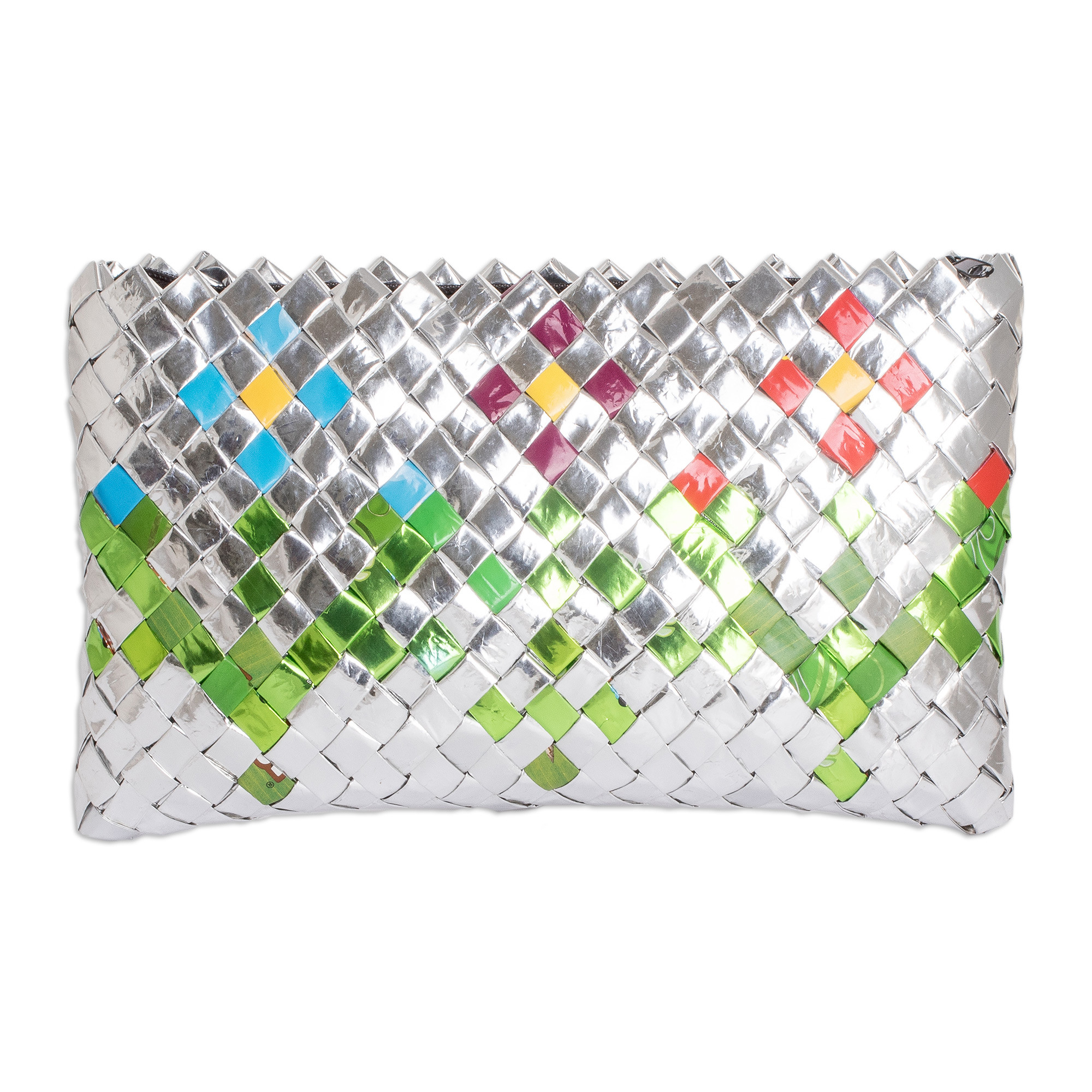 A shiny garden in vibrant colors adorns this metalized wrapper cosmetic bag, handcrafted by Maria Isabel Ramos from Guatemala. Determined to spread an eco-friendly message, the artisan handweaves every detail, adding a zipper closure, a cotton lining and a convenient interior pocket.