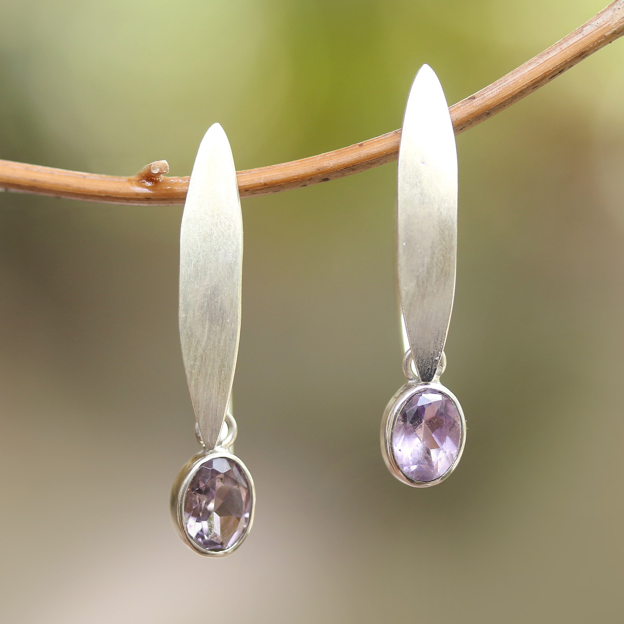 Below brushed-satin sterling silver ellipses, faceted amethyst ovals dangle elegantly. Balinese artisan Budiharta designs these earrings, which adorn the ears on long sterling hooks.
