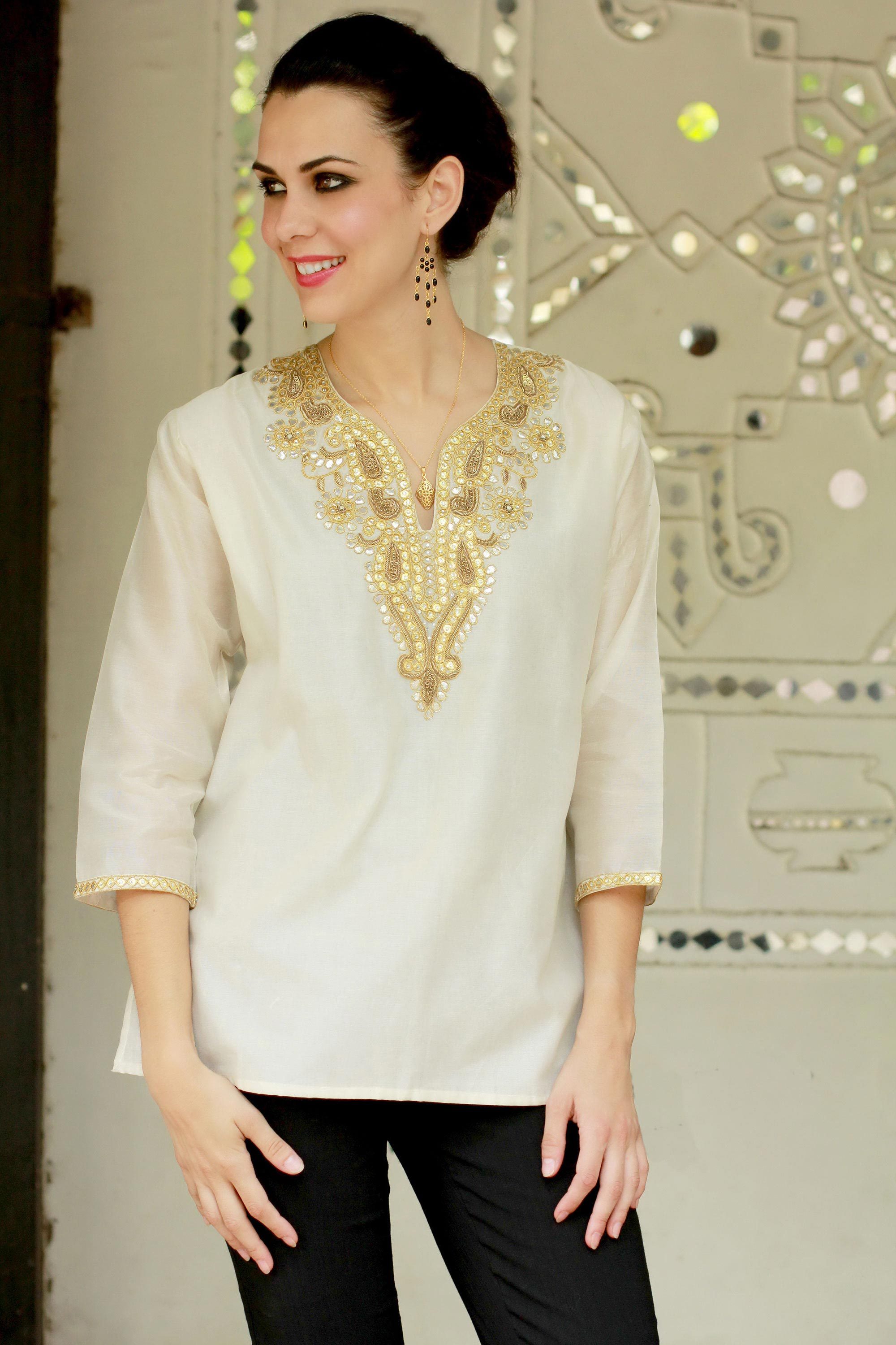 With its lavishly encrusted collar and shimmering gold cuffs, this ivory tunic seems styled after the garments of royalty. By Isha Jain, this delicate cotton and silk-blend tunic is hand-embroidered in the gota style which combines needlework with intricate beading, sequins, and fabric applique. This is a stunning and figure-flattering look to bring extra elegance to any special occasion.