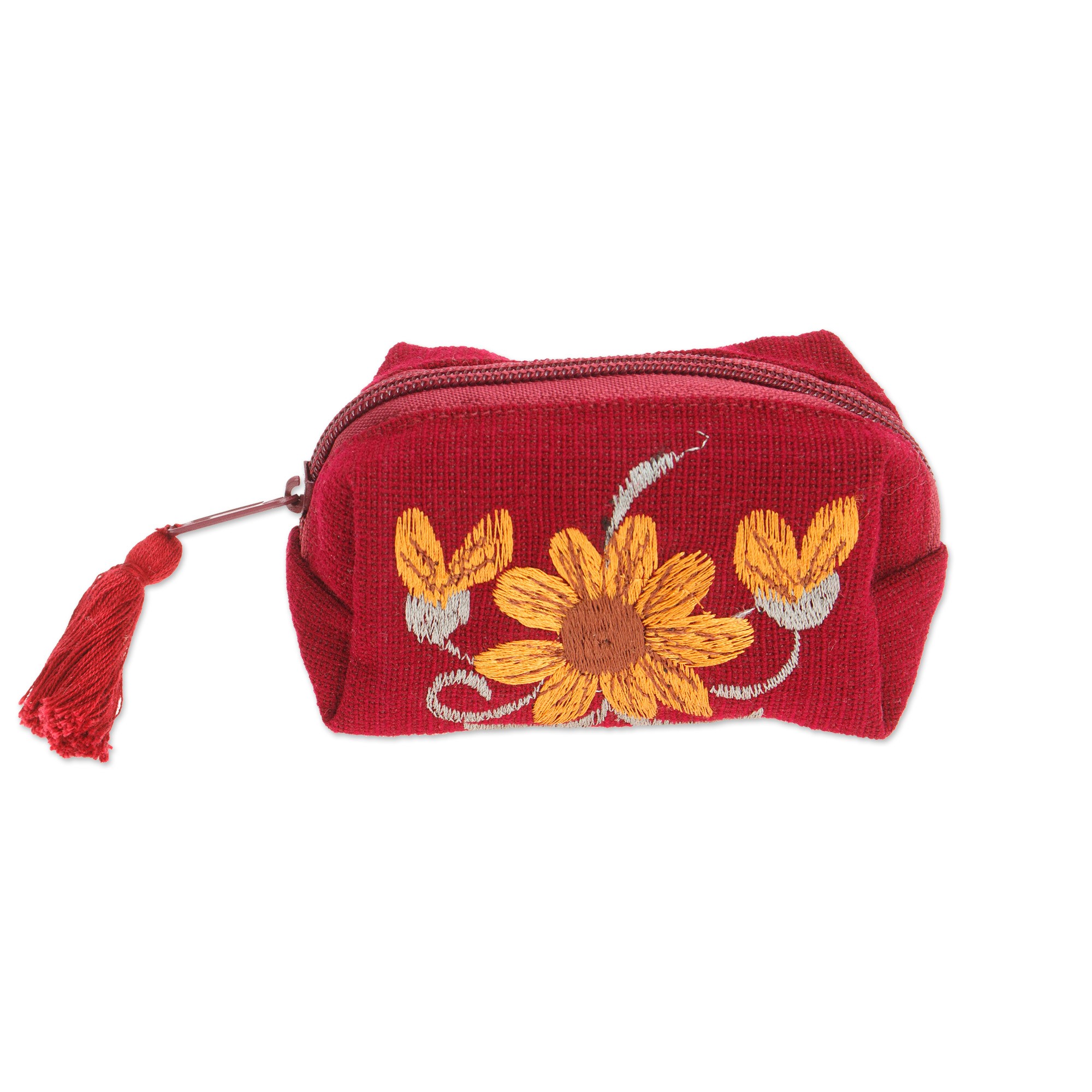 Embroidered Floral Burgundy and Marigold Cotton Coin Purse, 'Burgundy Spring'