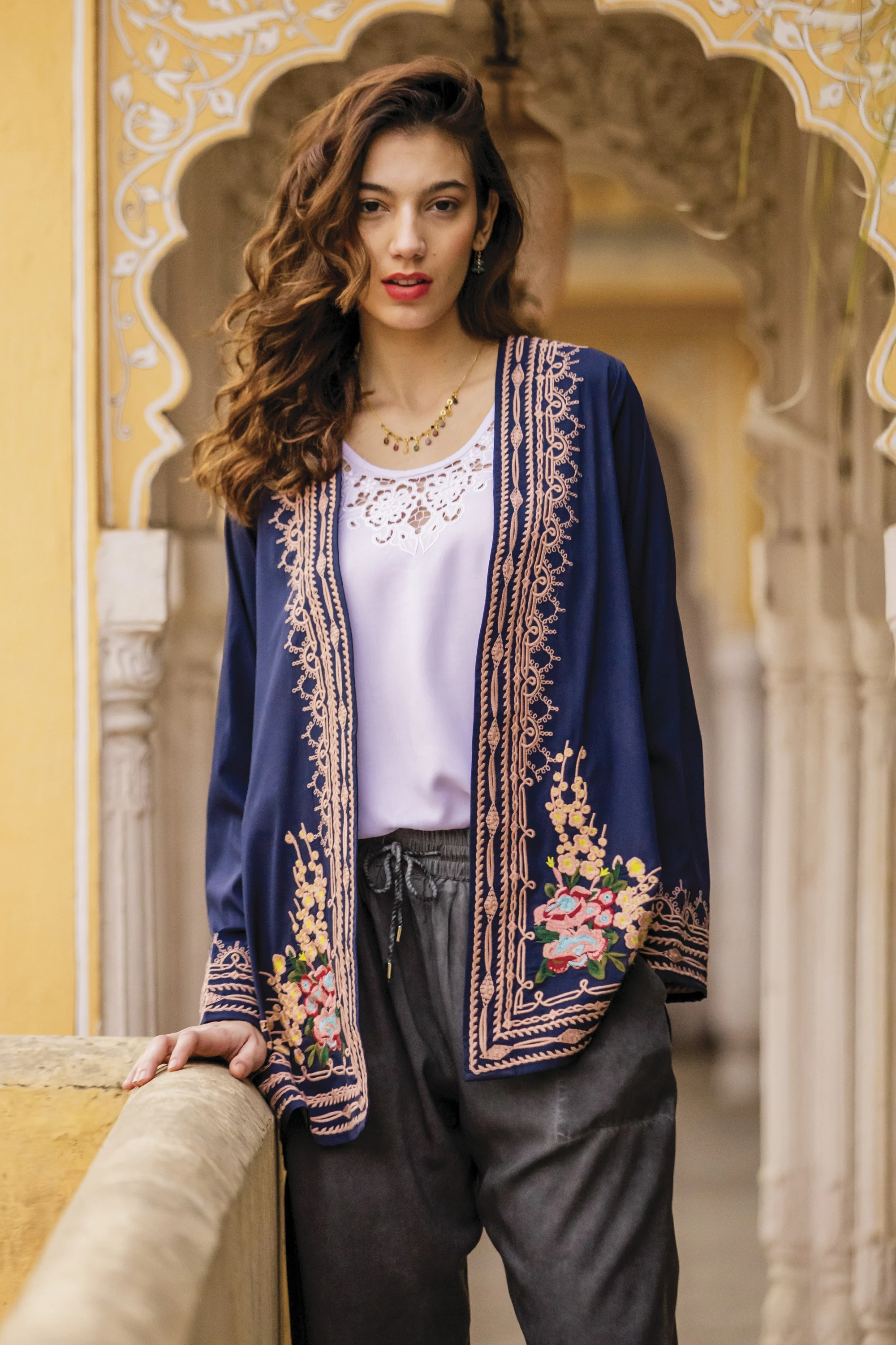 Roses have a deep-rooted history in India, and their cultivation can be traced back to the Mughal era. Here, Indian roses gracefully decorate a gorgeous poly crepe layering jacket crafted to be the star of any outfit. Embroidered beige motifs, inspired by the dapper decorations of the many palaces dotting the landscape of Rajasthan, add soft lines to the neckline, front opening and sleeve hem, complementing the garment's sapphire base hue to create a look reminiscent of India's midnights.