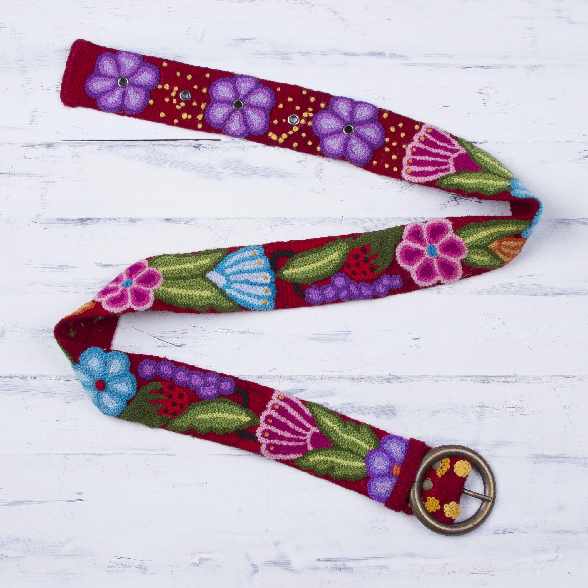 Embroidered Floral Wool Belt in Cherry from Peru, 'Garden Fashion in Cherry'