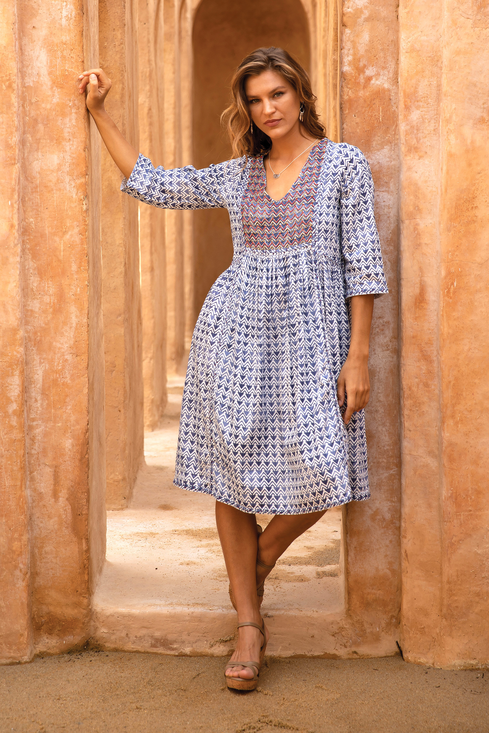Embroidered accents and beadwork decorate this perfect springtime dress - all enriched by an indigo chevron pattern that extends to the knee-length skirt and three-quarter sleeves. Thoughtfully designed with a V-neckline, side seam gathers and handy side pockets, this relaxed fit dress combines practicality with effortless charm, making it a versatile addition to your seasonal wardrobe.