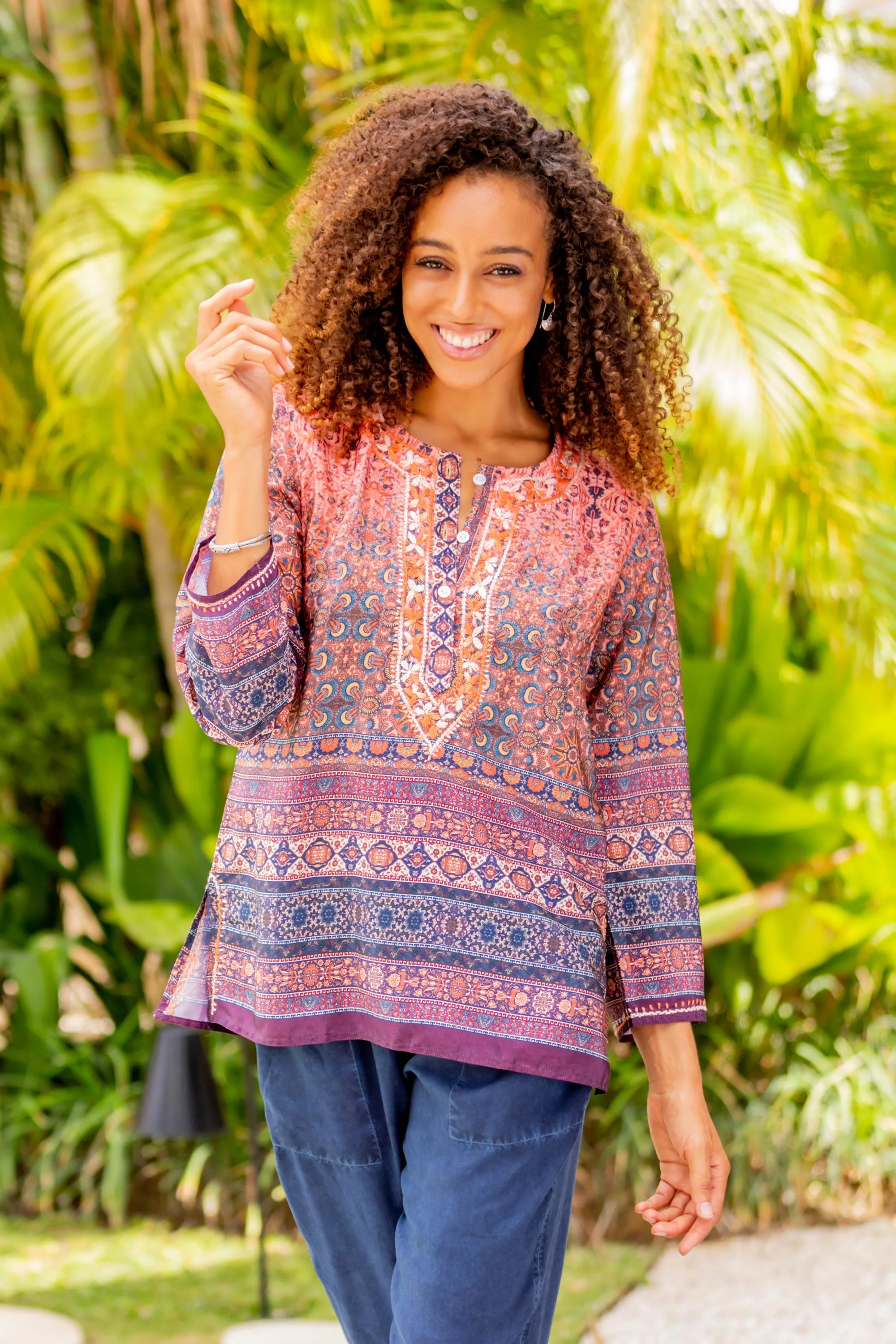 Intricate mandalas and repeating geometric patterns inspired by centuries old motifs grace this flowy printed polyester tunic. Hand embroidery in tonal colors frames the button front neckline.