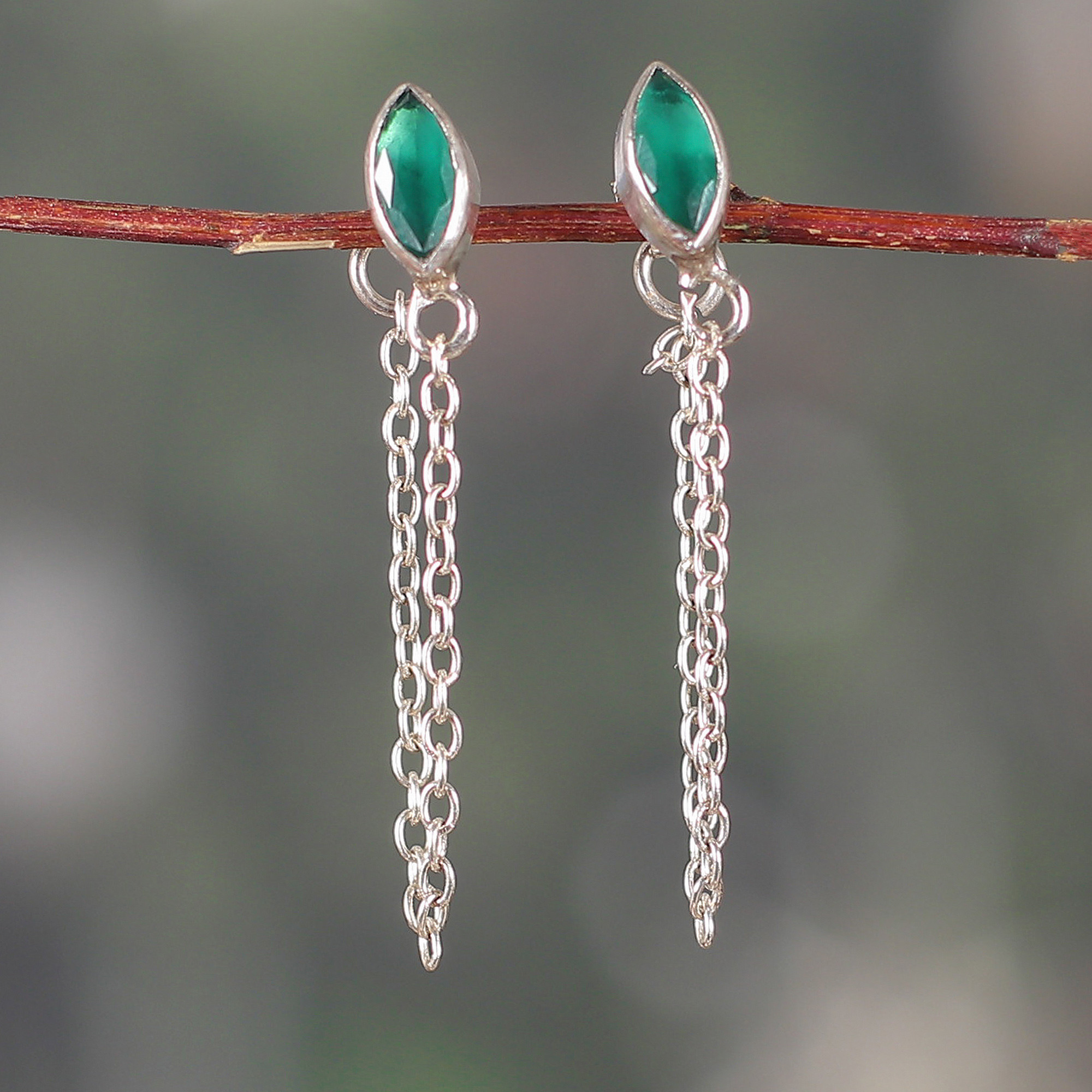 A hanging chain of polished sterling silver goes all the way from the front to the back of these fashionable dangle earrings. Indian artisan Bhavya Jain's flowing design is accented with marquise-shaped emeralds, adding color and a luxurious touch to any ensemble.