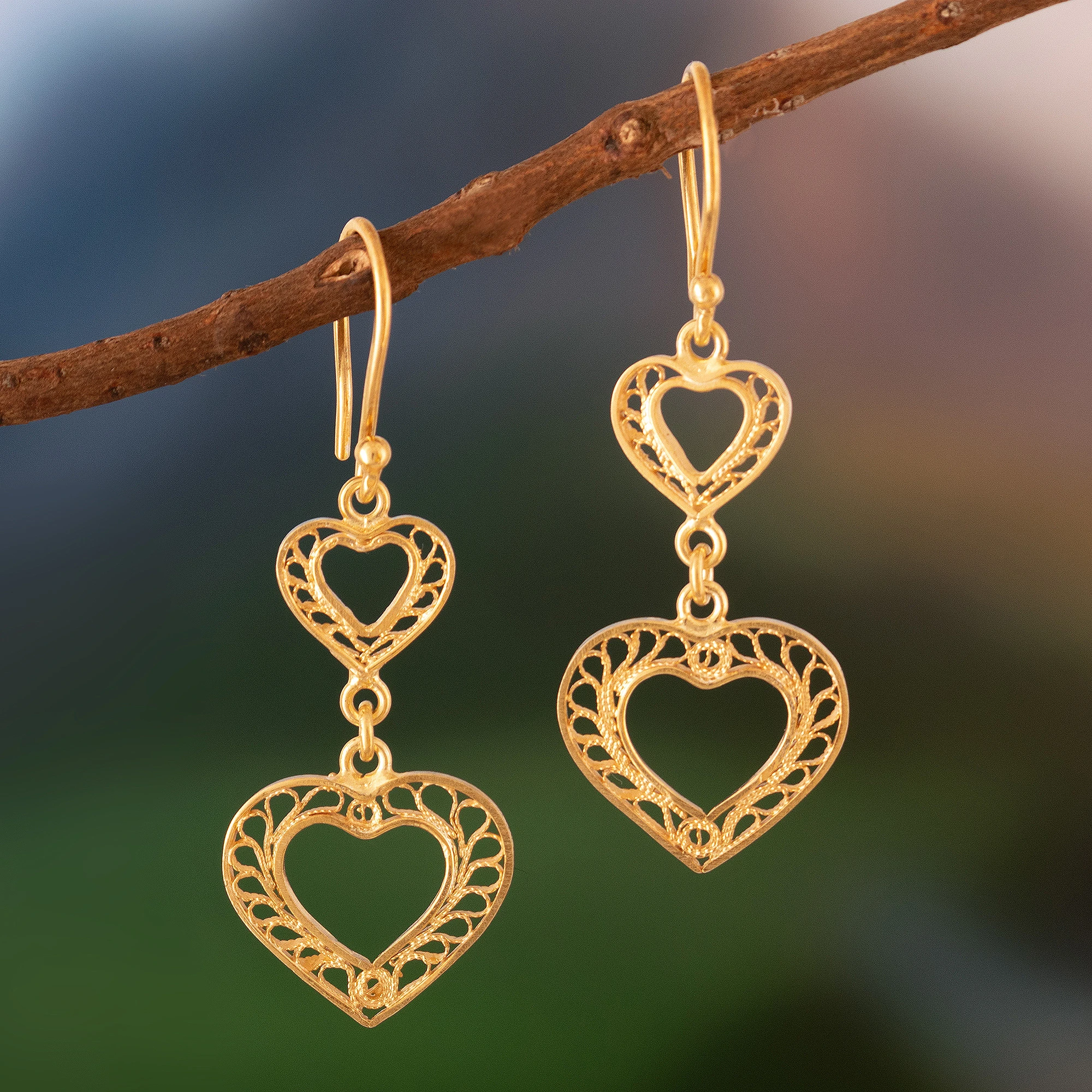 Make her feel like your queen with these radiant double-heart dangle earrings. Giuliana Valz-Gen created this exquisite pair in the Catacaos style, and plated the sterling silver with shimmering 21k gold. Enchant with this token of your love that is sure to liven up any ensemble.
