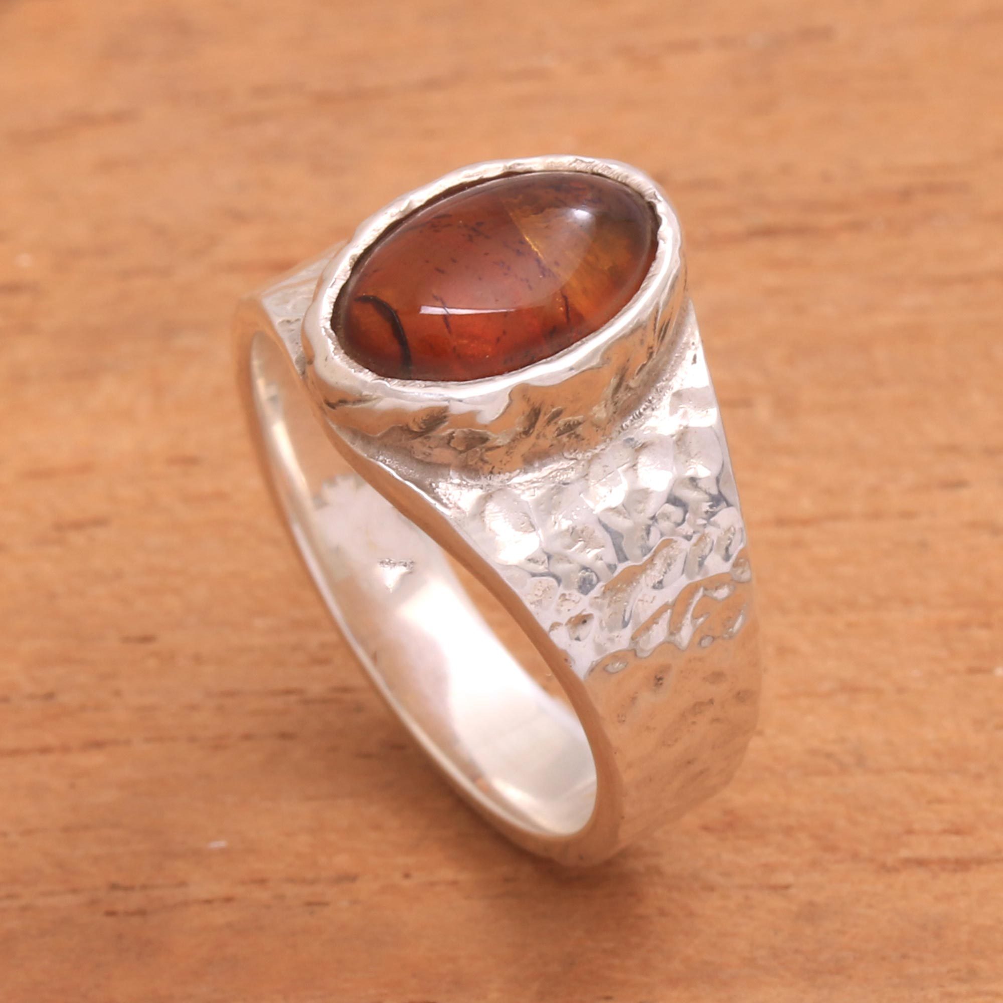 Crafted of sterling silver, a textured band encircles the finger in this cocktail ring from Bali. Representing a local artisan collective, the Mutiara Collection presents the ring. An eye of natural amber centers this fascinating accessory.