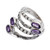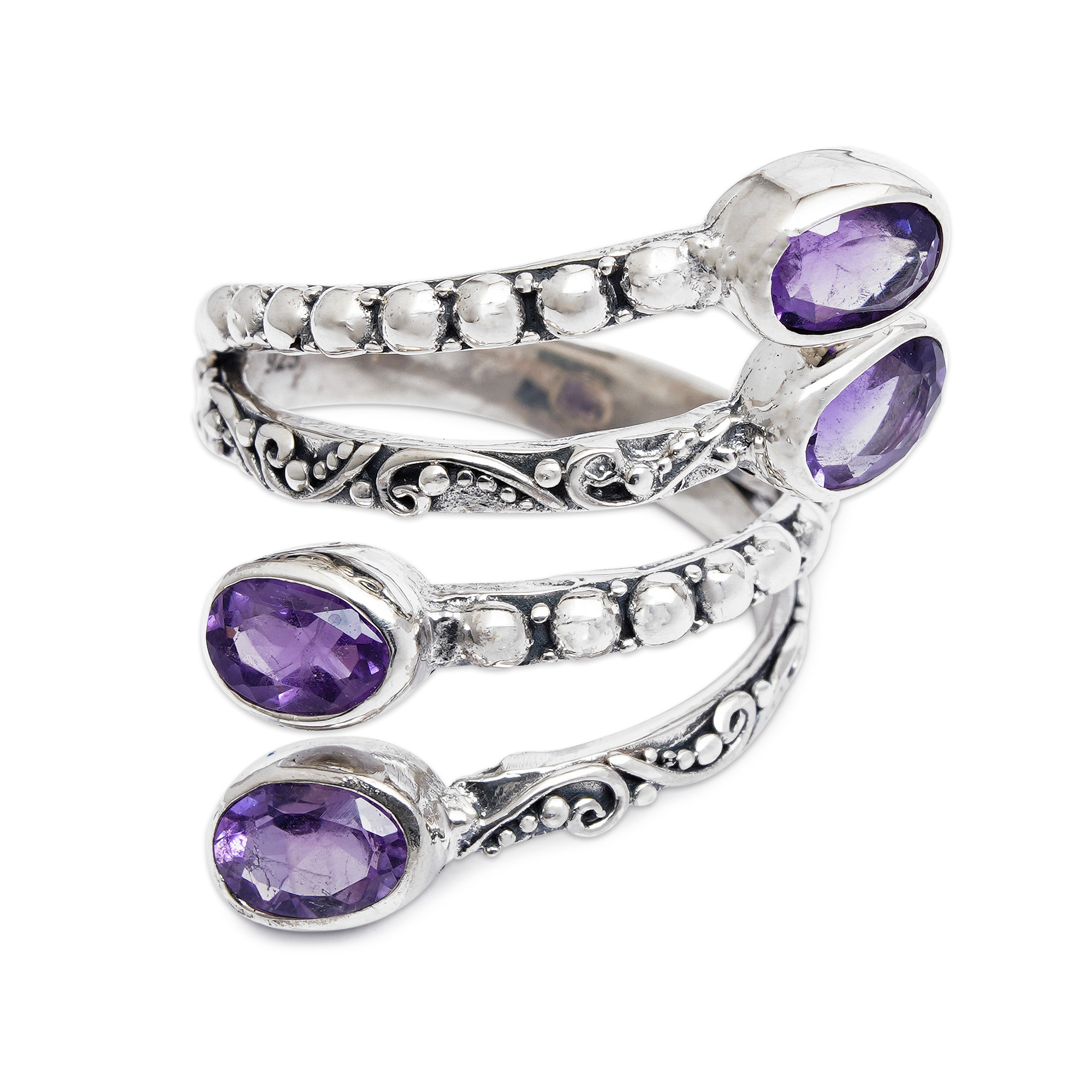 The roots of Bali are precious and filled with wise beauty, like this sterling silver creation by artisan Anya. Traditional silversmithing techniques allow this wrap ring to embrace your finger in a sublime arrangement of classic details, enriched by polished and oxidized finishes. The piece has faceted amethyst jewels, each a symbol of enchantment.