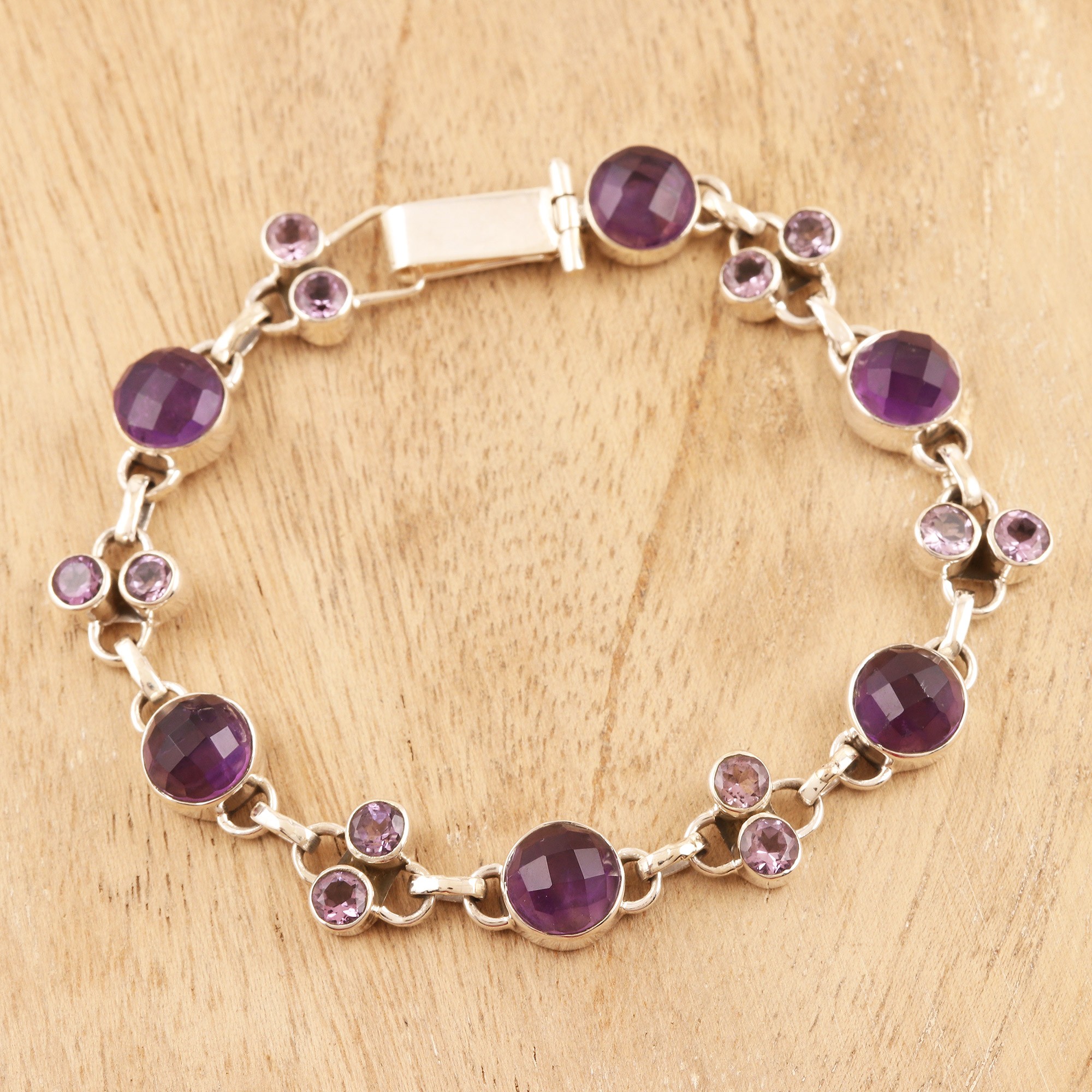 A total of four carats of faceted amethysts are set within sterling silver bezels in this link bracelet presented by India's Neeru Goel. Six larger round amethysts alternate with pairs of smaller round stones reminiscent of purple grapes to create a beautiful birthstone bauble for those born in February.