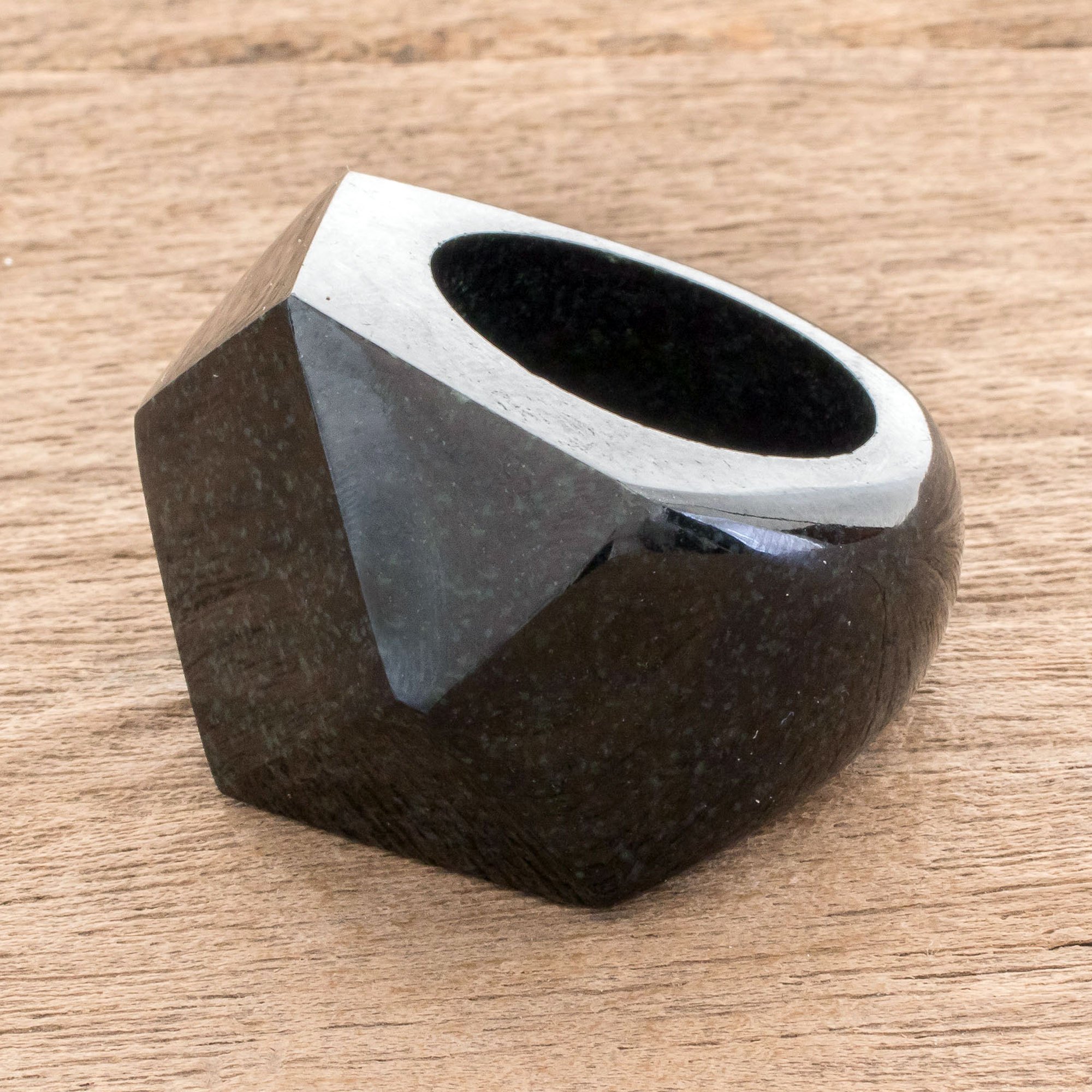 Hand-carved from a single piece of natural dark green jade, this unisex ring is created by Guatemalan artisan Zandra Lorena Sajbin. She carves the front of the ring with bold facets that gleam in the light.