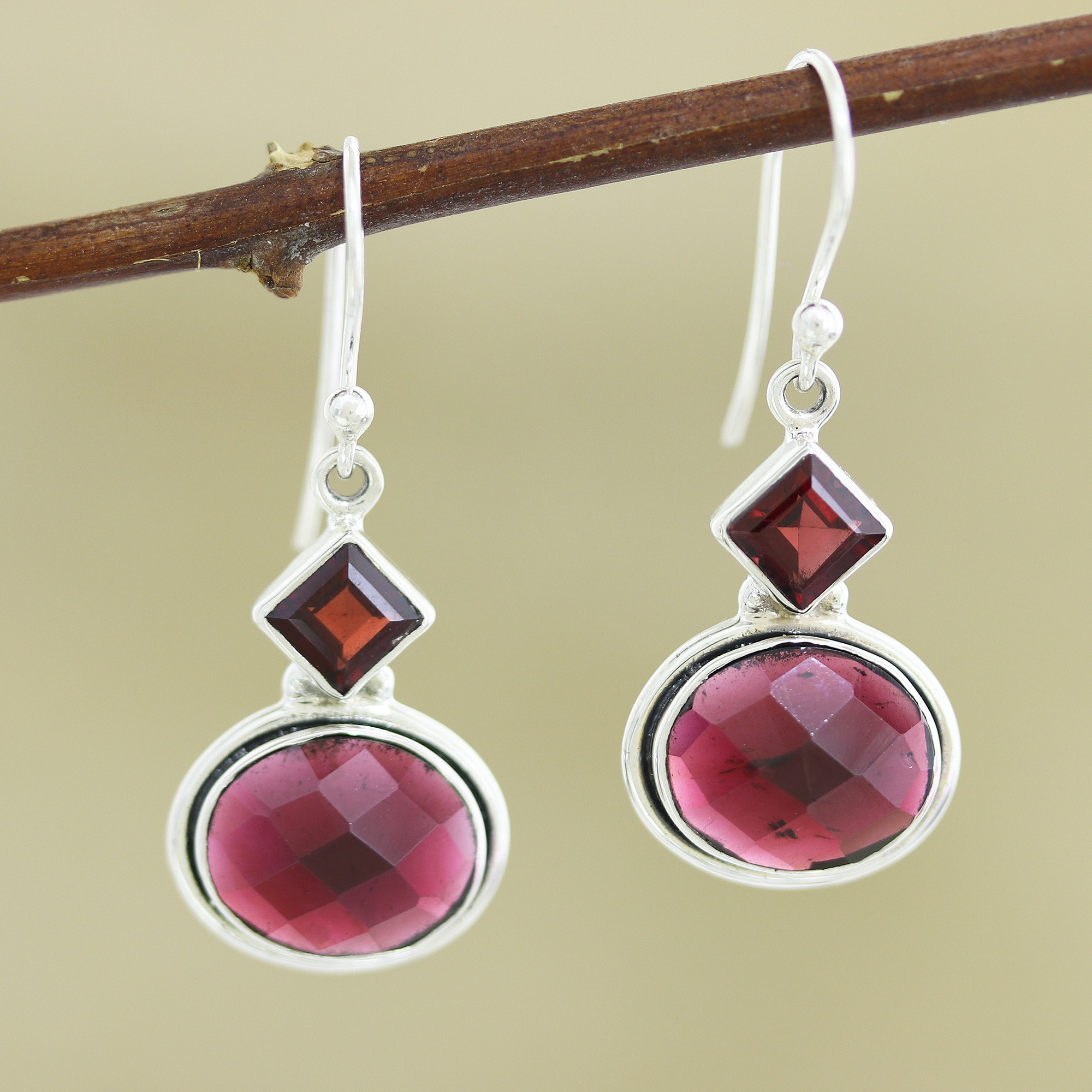 Checkerboard-faceted oval garnets are set horizontally within sterling silver bezels in these dangle earrings by Neeru Goel of India. The oval garnets are accented by squares of faceted natural garnets above.