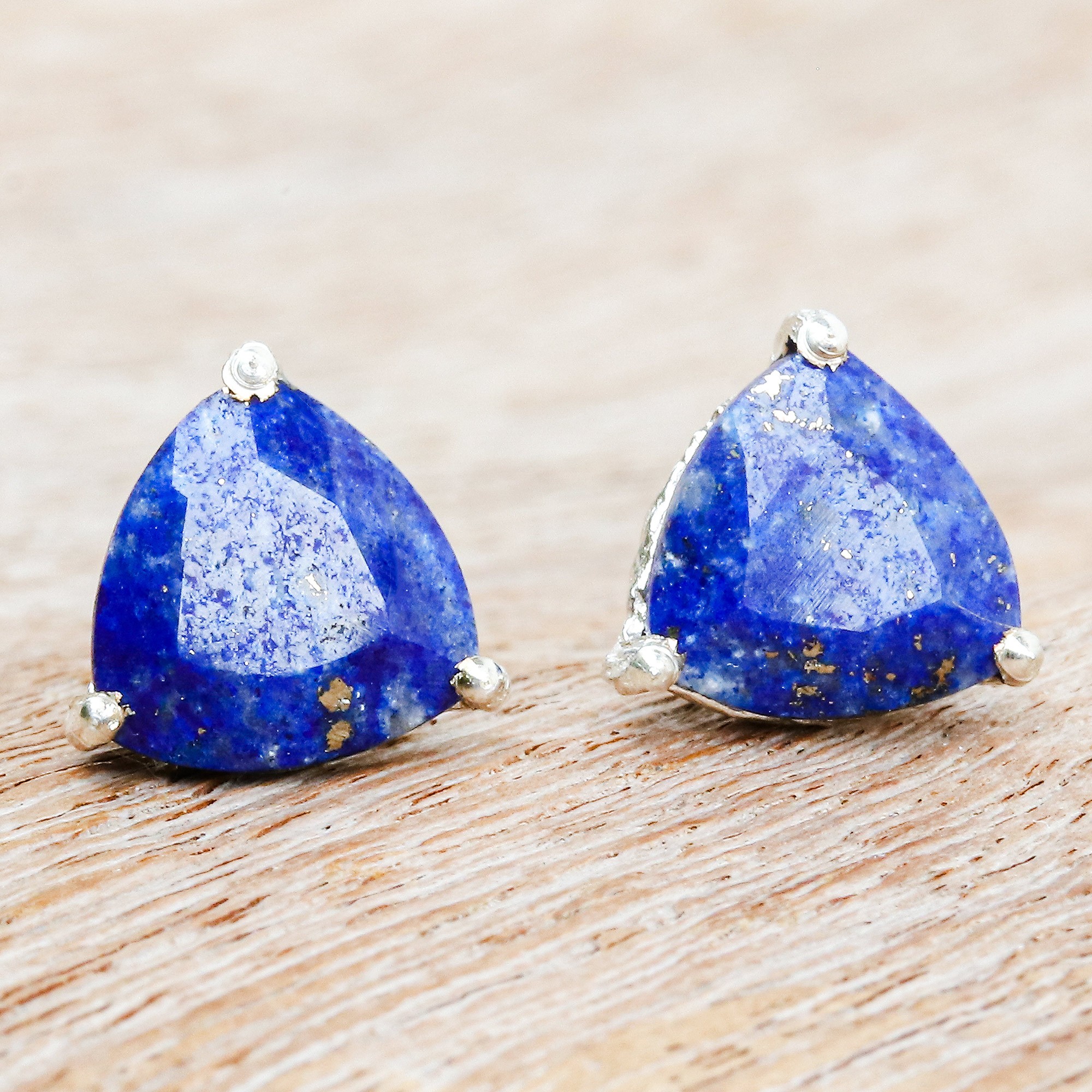 Decorate your ears with the beautiful blue triangles on Chatchanop Naratcharuj's stud earrings, perfect for achieving a colorful look. The Thai artisan uses a faceted lapis lazuli gem to craft each earring, setting the stone in a sterling silver prong setting.