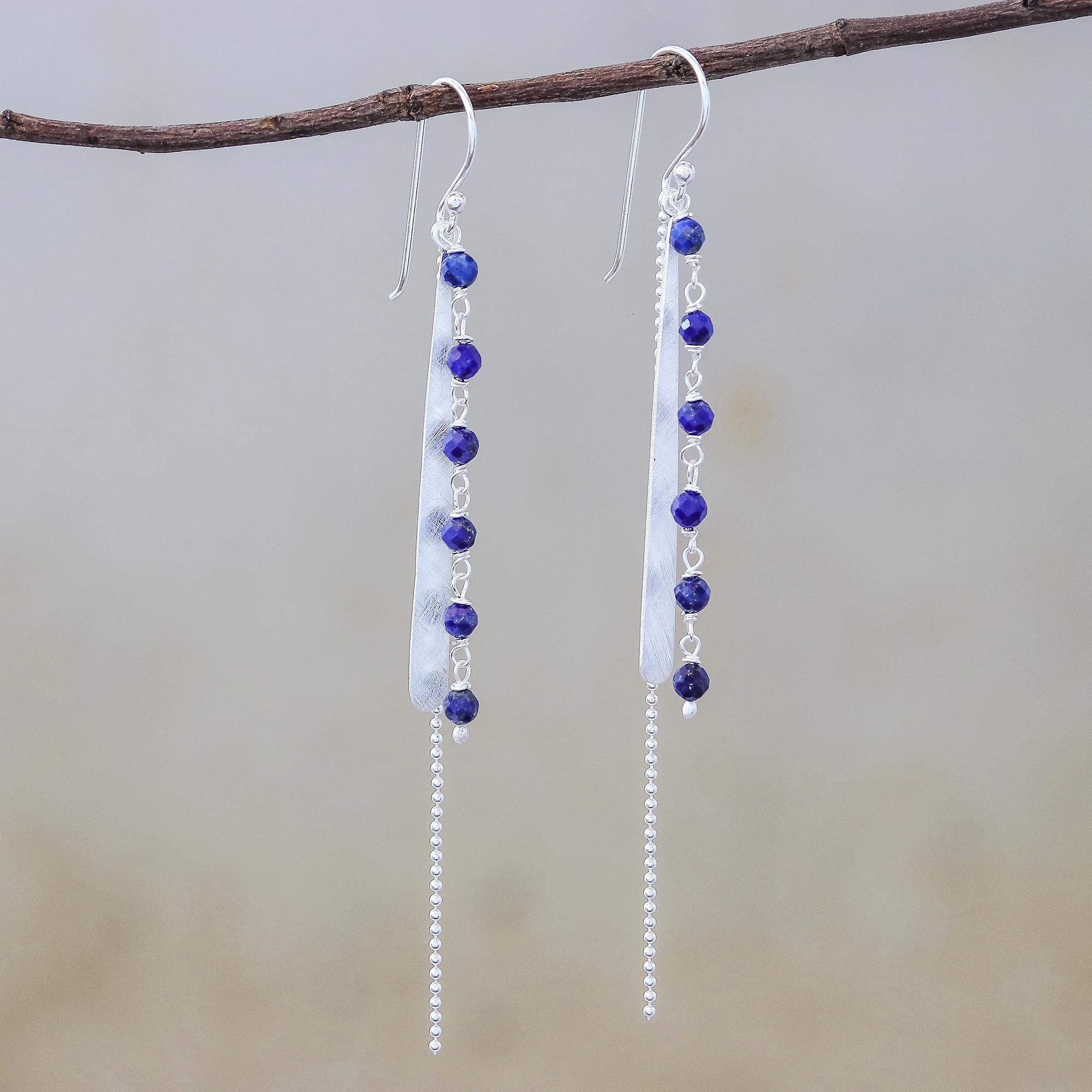 Framed against long teardrops of brushed-satin sterling silver, faceted lapis lazuli gemstones are beautiful. Thai artisan Somsiri Juntamin creates these dangle earrings, which are completed with petite lengths of sterling ball chain.
