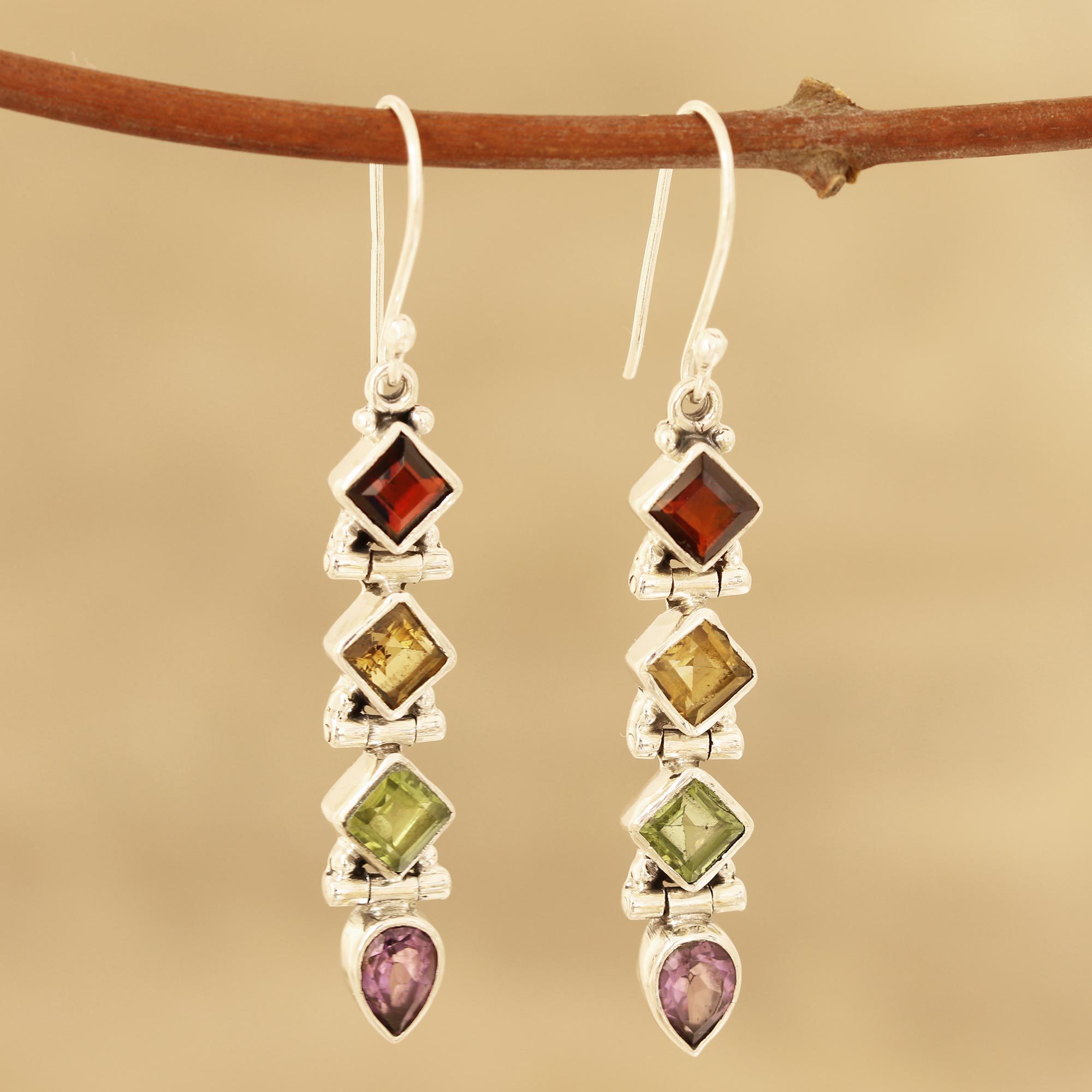 A fusion between garnet, citrine, peridot, and amethyst gems makes a beautiful pair of dangle earrings from India. Neeru Goel presents the earrings, which are crafted of sterling silver by local artisans. Each link between the gemstones is hinged so that the entire earring can swing freely.