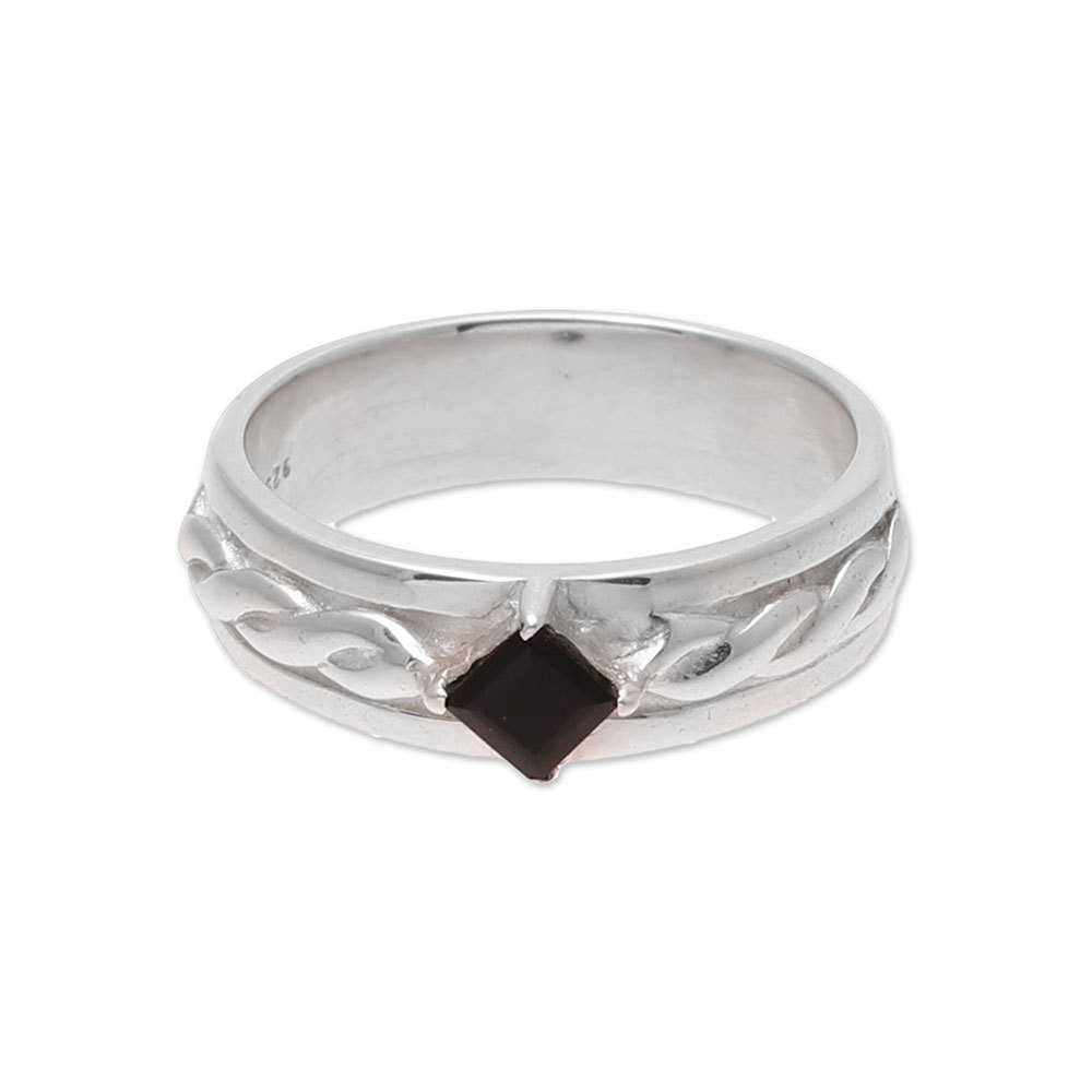 Sparkling with dark hues, a square of invigorating onyx centers this solitaire ring from India. Presented by Bhavesh, this ring circles the finger with a rope-pattern band of sterling silver.