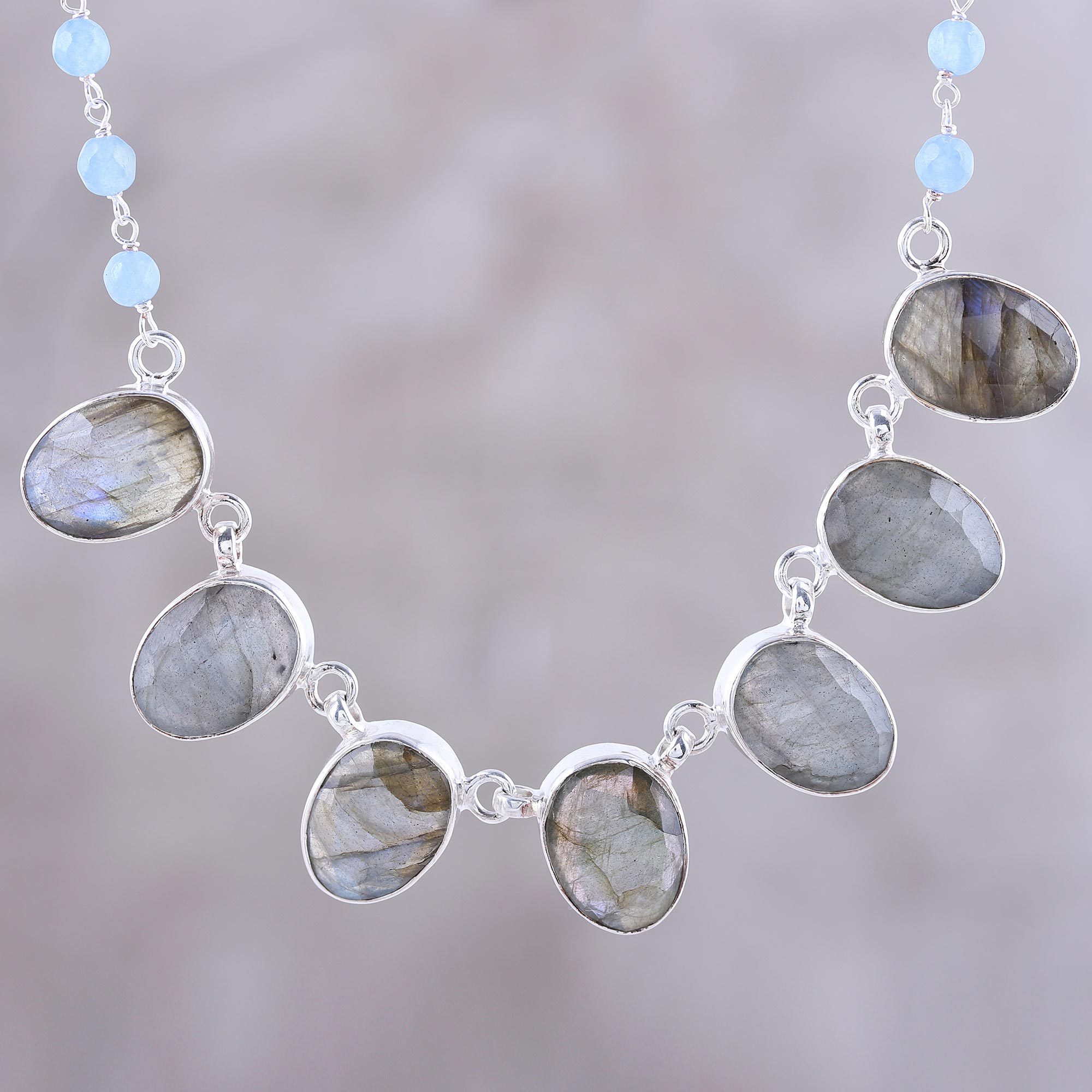 Neetu Barathi of India designs this lovely pendant necklace with the enchanting colors of a stormy sky. Connected by sterling silver links, a row of seven faceted labradorite ovals hang between two sets of chalcedony beads dyed a beautiful sky blue. The necklace has a sterling silver cable chain with an extender to easily adjust the length.