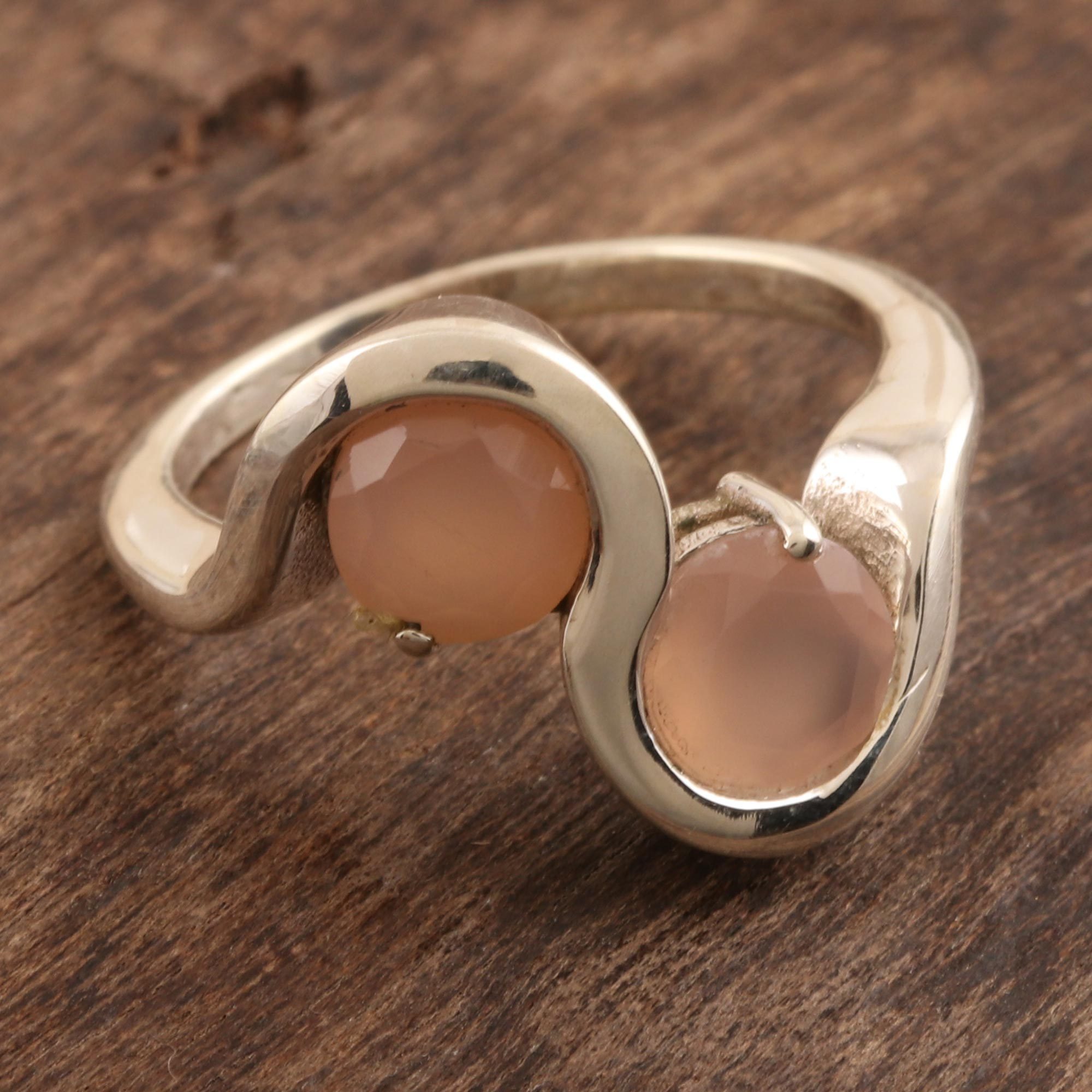 The curvy appeal of this cocktail ring is complemented by two faceted stones of pink chalcedony. Rakesh Rana in India designs the ring, which is crafted from polished sterling silver.
