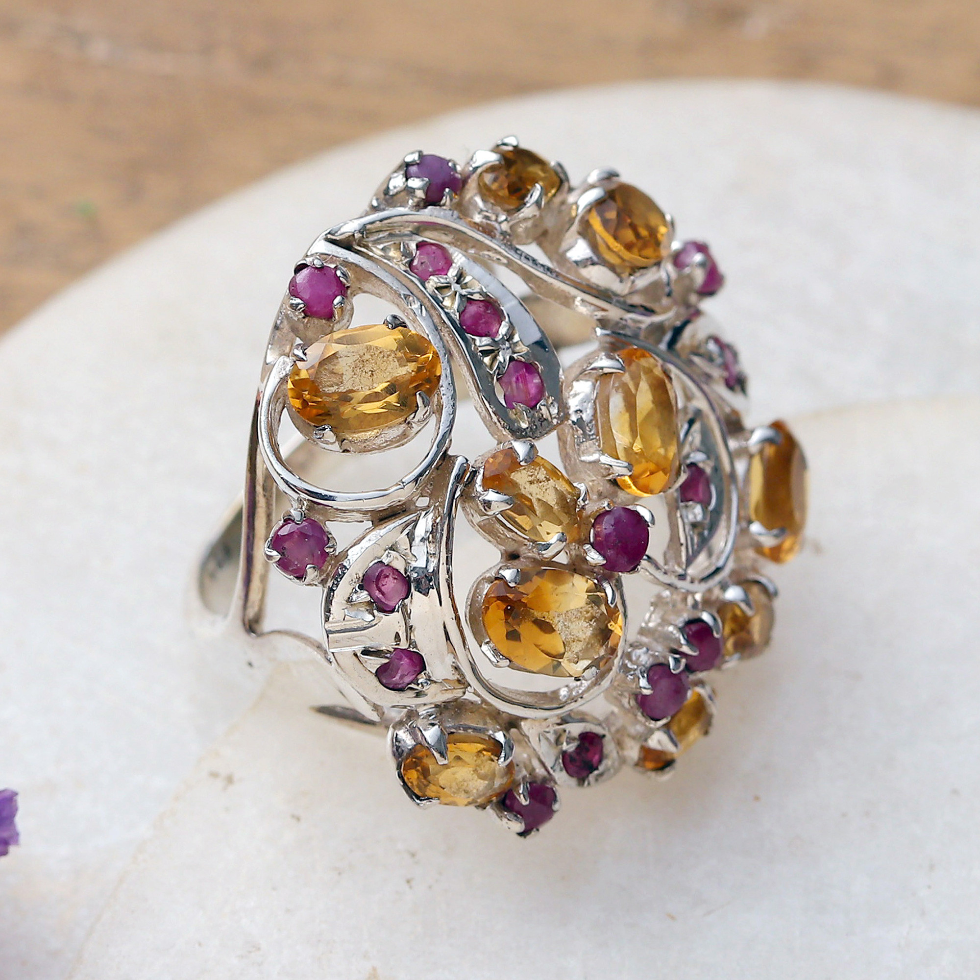 Radiant citrine stones tangle with the sweet hues of faceted ruby jewels, transporting you to a paradisial garden. Alok Jain of India presents this sterling silver cocktail ring, inspired by the region's nature. The jewels unite their colors in an intricate design, totaling over six carats.