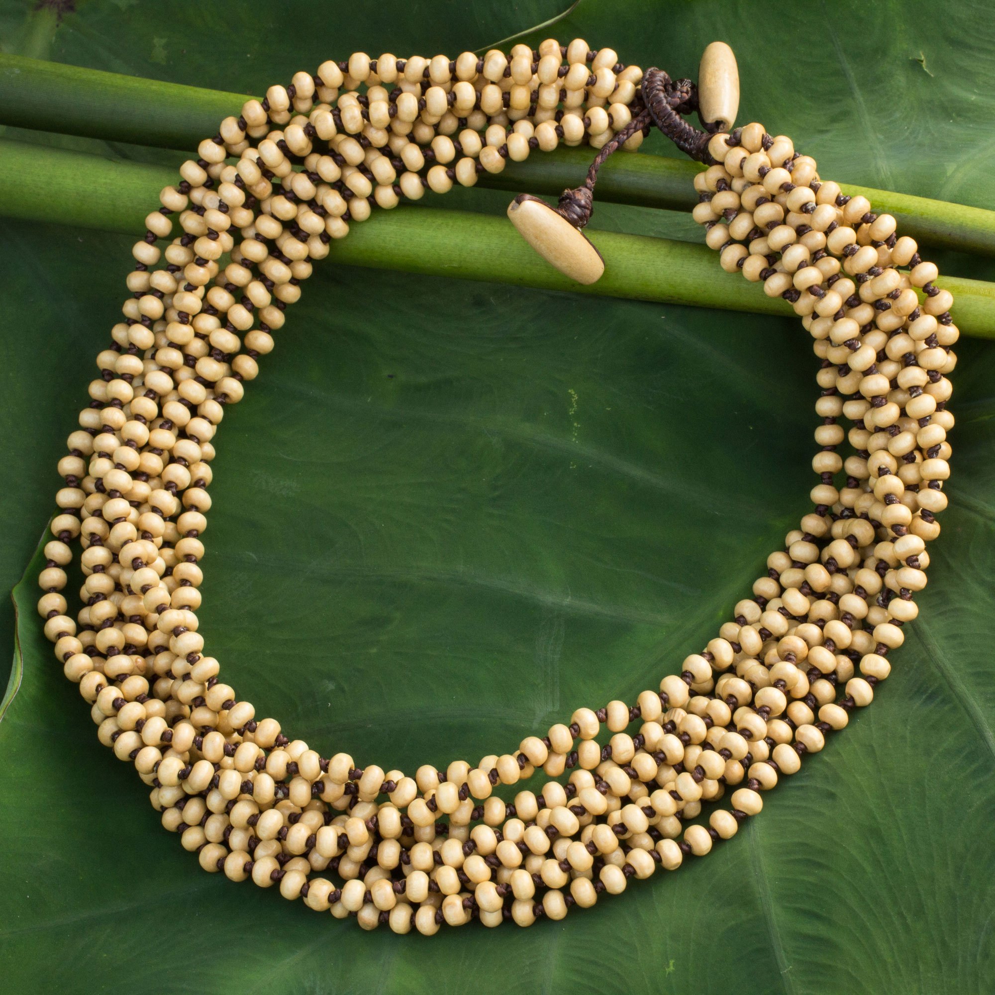 In light and dark brown, this torsade necklace is by Sumalee Nawakul. She crafts the necklace by hand with beads of littleleaf boxwood in their natural color, creating 10 hand-knotted strands that twist into a necklace that can fasten at two different lengths.