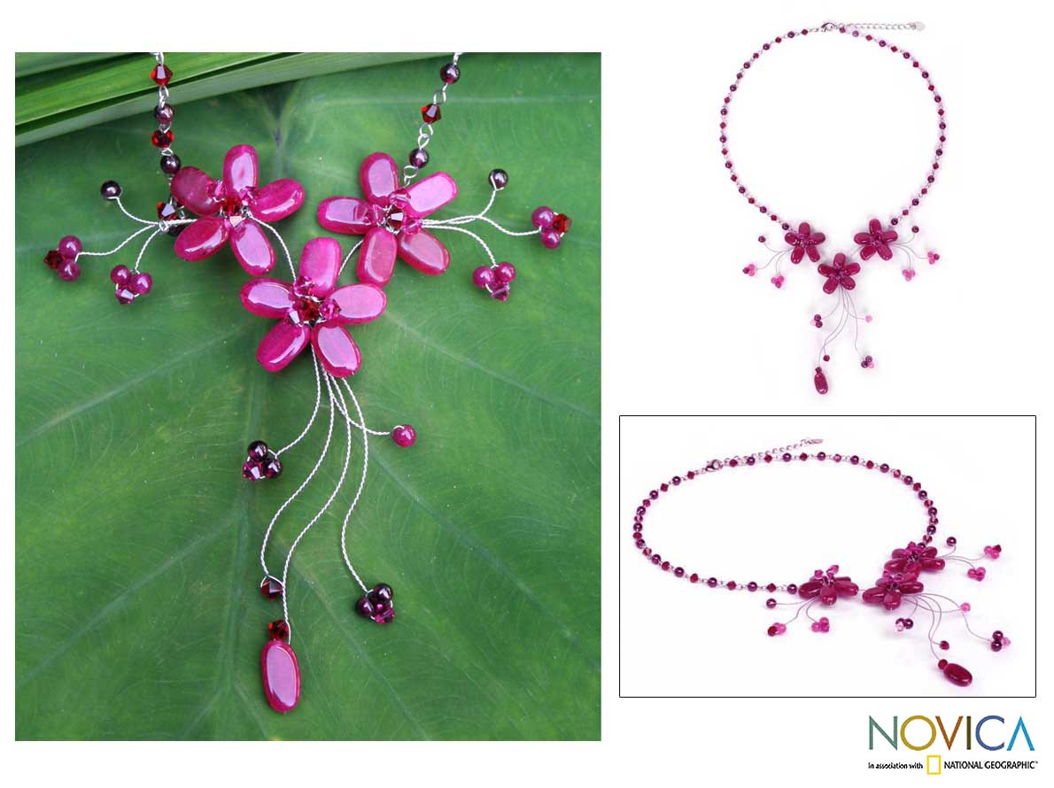This cheerful floral necklace, designed and carefully handcrafted by jewelry artisan Busarin, inspires sentiments of spring renewal and rebirth. It features a lovely rosebud trio, incorporating elements of quartzite, garnet and fine glass beads.