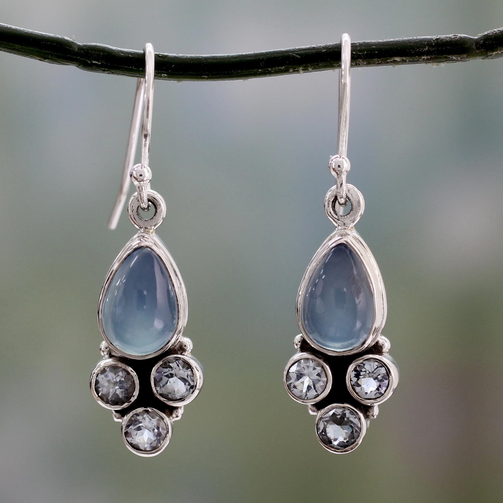 Cool chalcedony evokes azure moonlight in beautiful dangle earrings. From Shanker in India, they feature three blue topaz stones that total some 2 carats. The gemstones are set in polished sterling silver, with a dark background to set off the faceted gems.