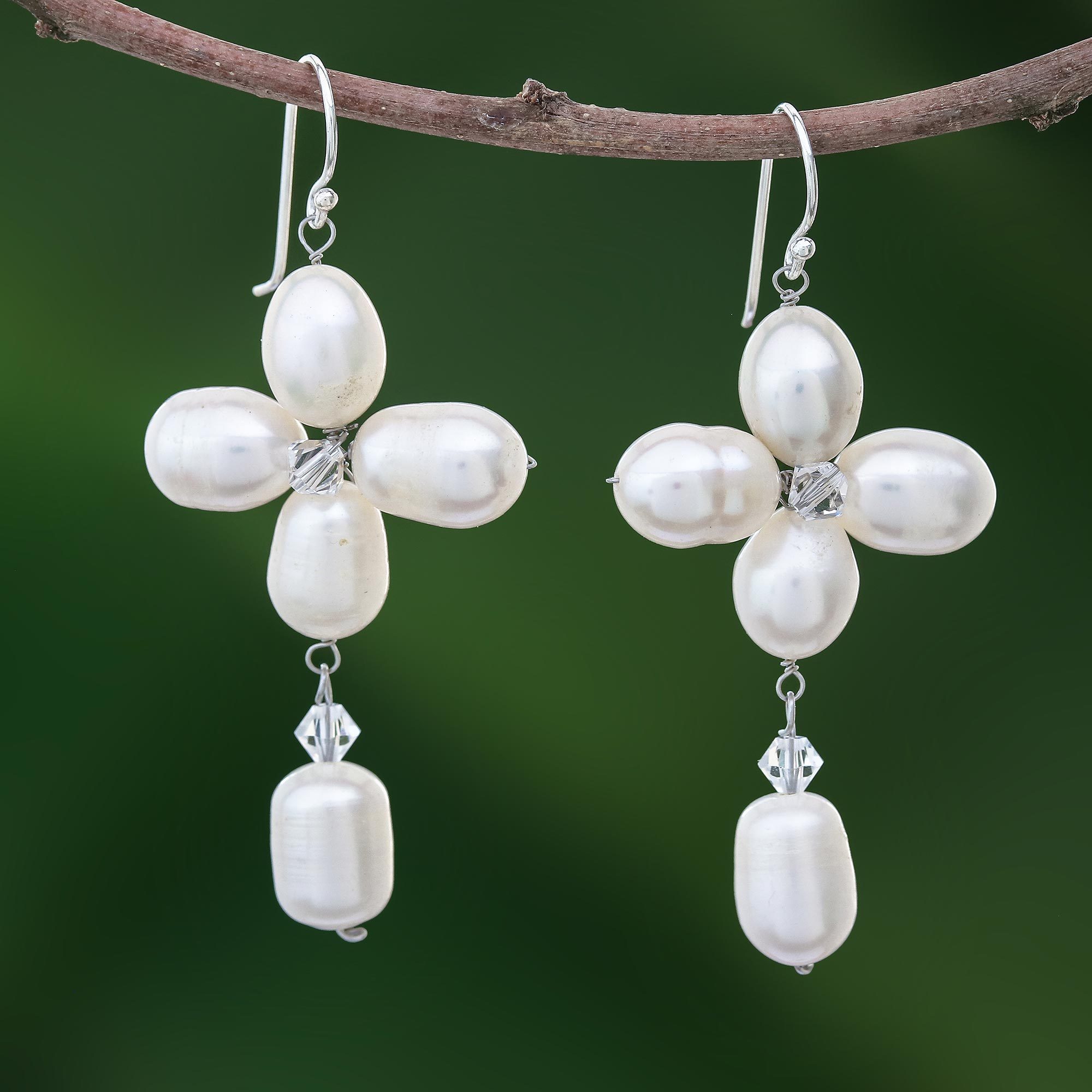 Clovers shimmer with pristine beauty in a design by Thailand's Sasina. She crafts the earrings by hand with iridescent pearls. Glass beads glisten like morning dew.