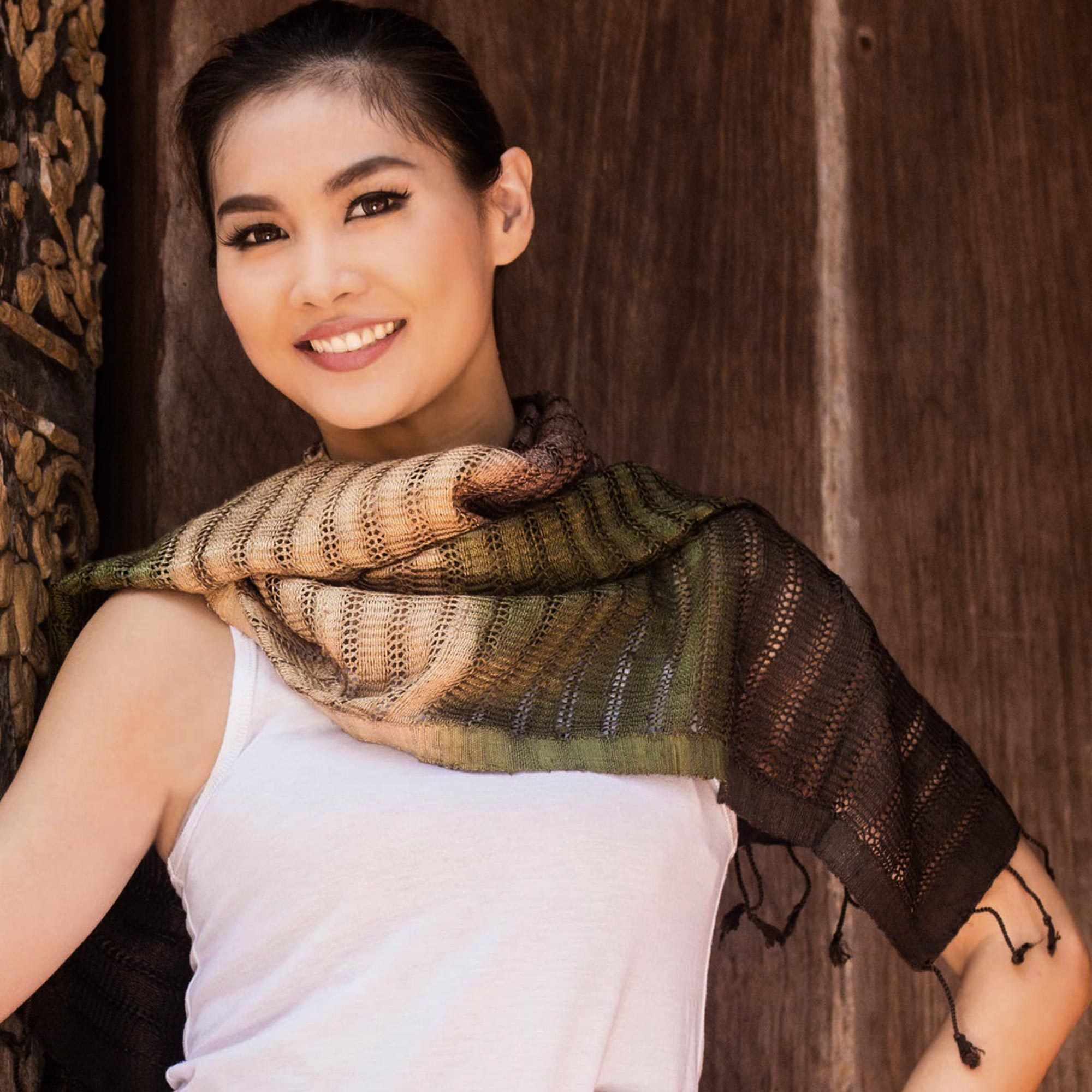 By Vinita in Thailand, this exquisite open-weave scarf combines vibrant tones of green, brown and beige. The motifs are created by hand using the tie-dye technique, which makes every scarf a unique work of art. The artisan uses luxurious bark silk, with its characteristic slightly rough textures.
