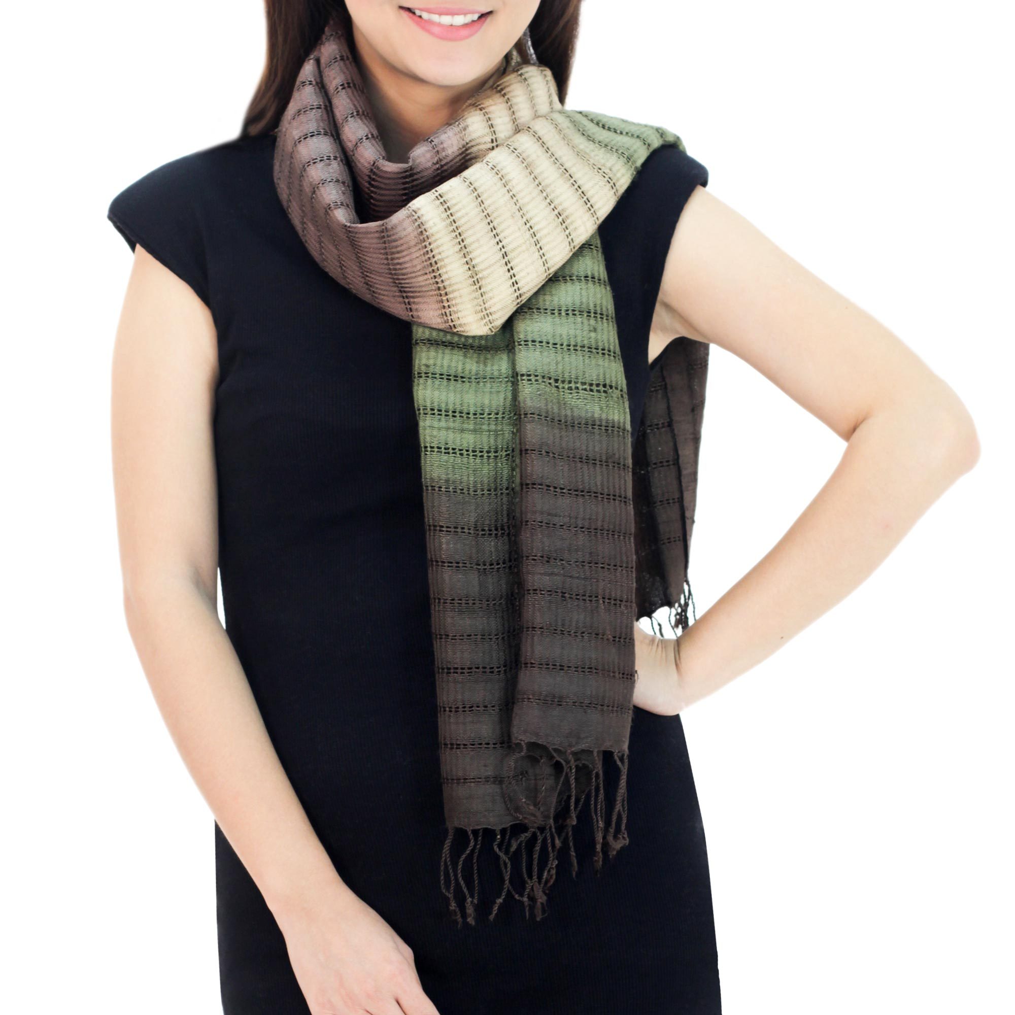 Fair Trade Green and Brown Tie Dye Bark Silk Scarf, 'Forest Evolution'